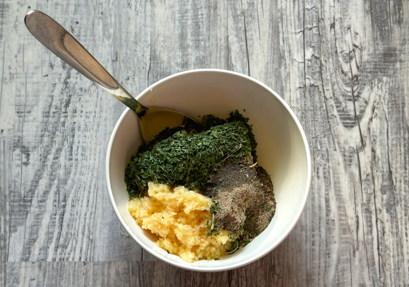 Next, you tackle the butter. In a bowl, stir together the butter, herbs, and garlic. Make sure the butter is very soft, or else it’ll be impossible to spread it onto the bread.