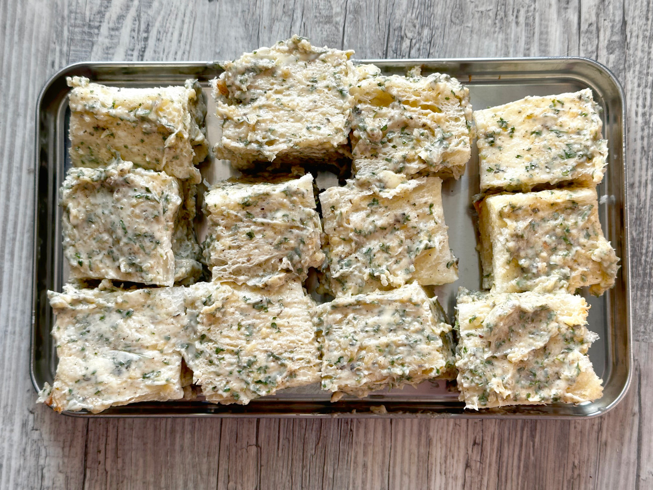 When it comes to the bread, you ideally want an Italian loaf or a loaf of soft, but sturdy, white bread. Using a heavy artisanal loaf will lead to a hard-to-chew garlic bread. Buying thin pre-sliced bread won’t yield the same dramatic effect.