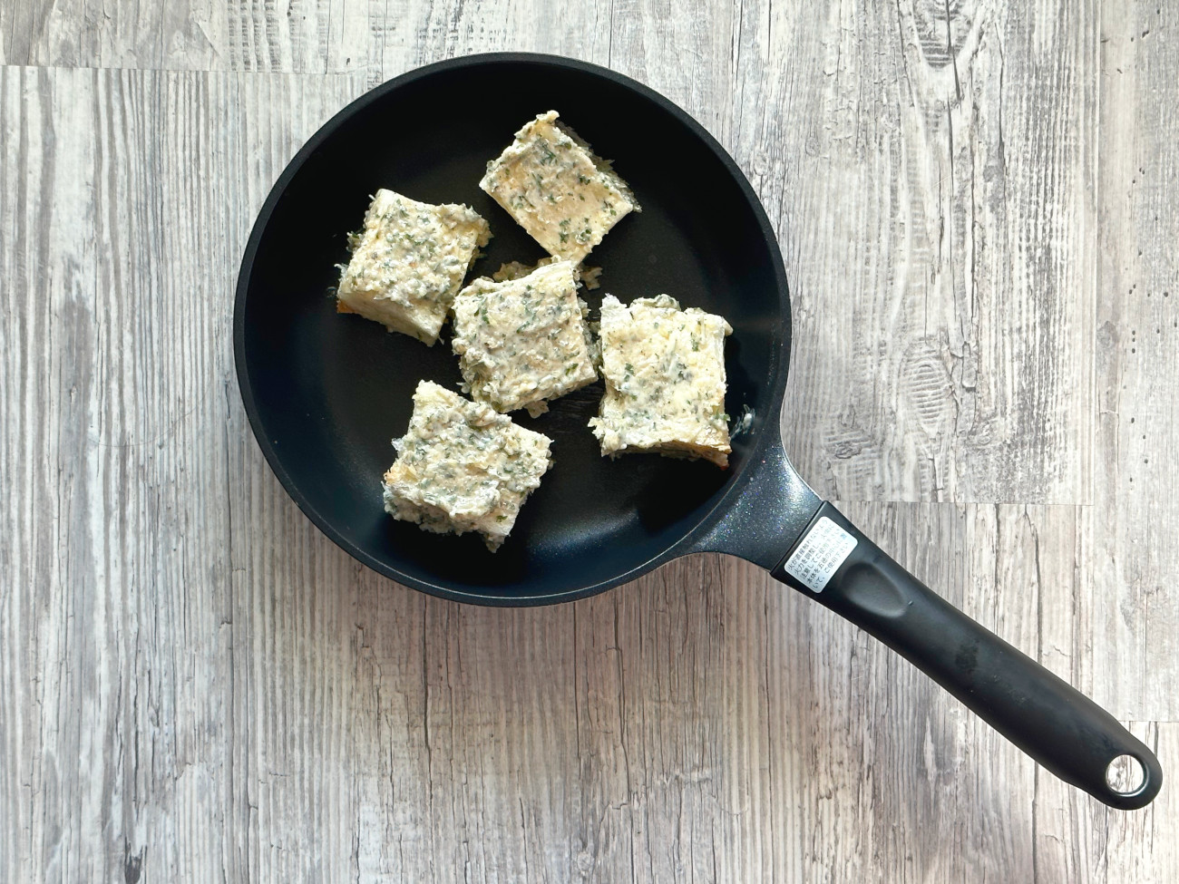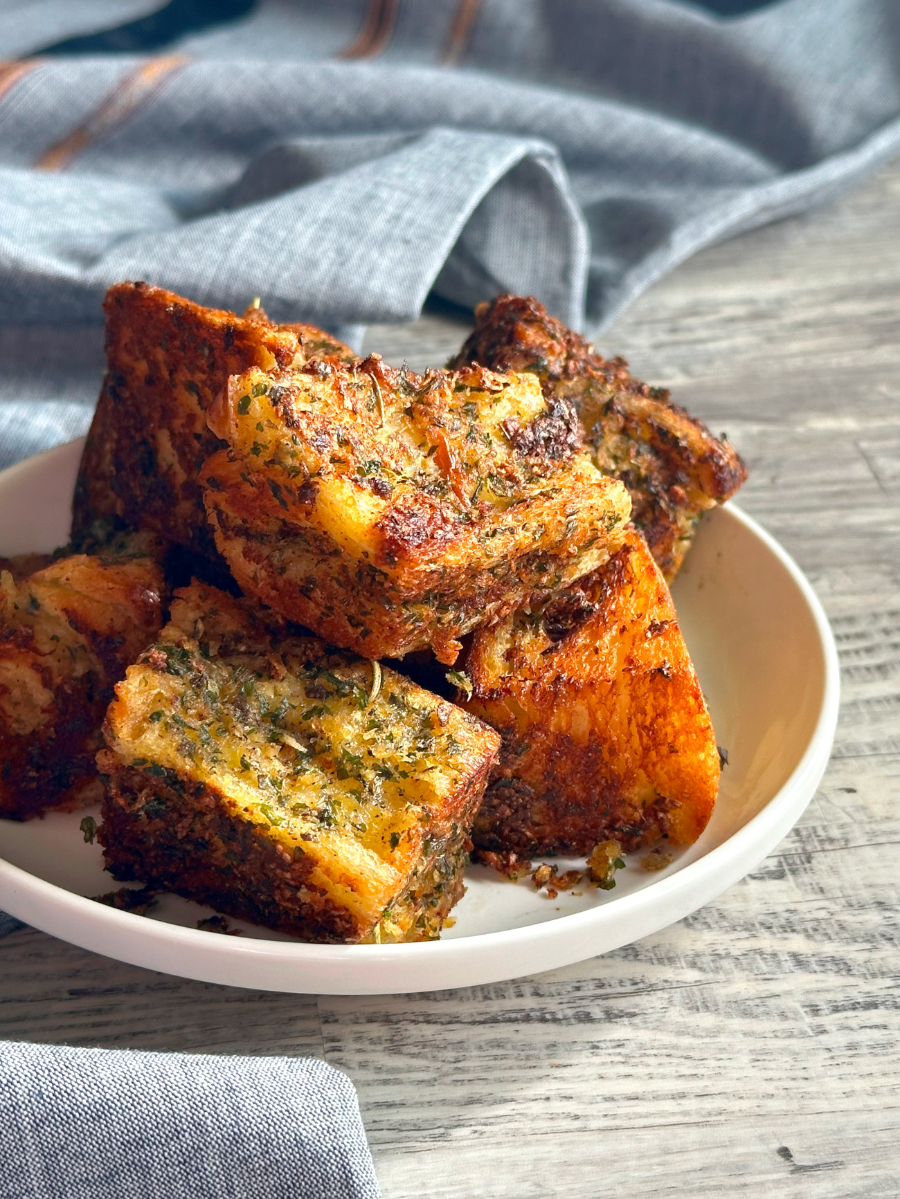 - To keep your hand clean use gloves and apply the butter mixture onto all sides of the prepared cubes of bread. Add into a nonstick skillet and cook on a medium heat flipping the bread onto all sides until all sides are golden brown, about 8 minutes.