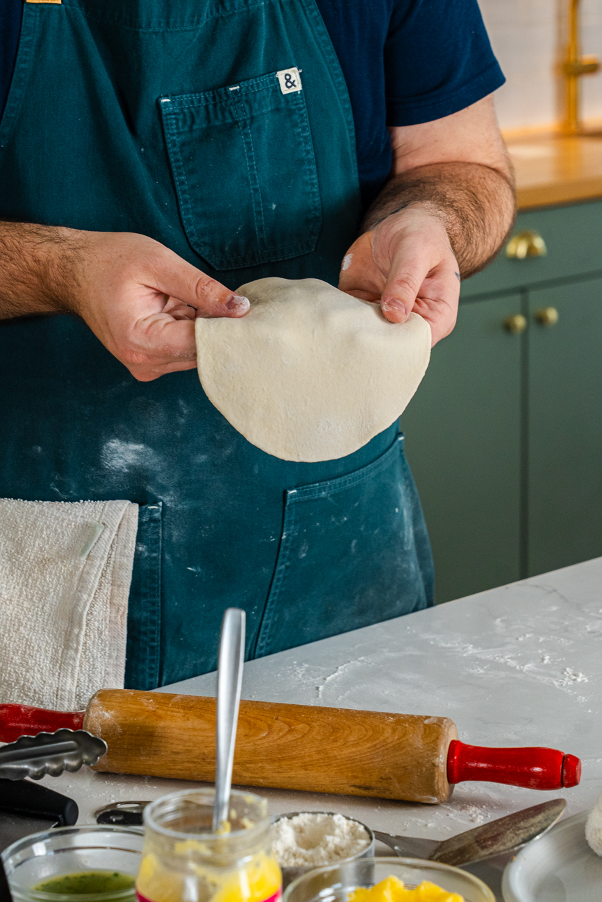 - Portion the dough into 5 even pieces and roll into a thin oval shape. Let it rest for 10 minutes.