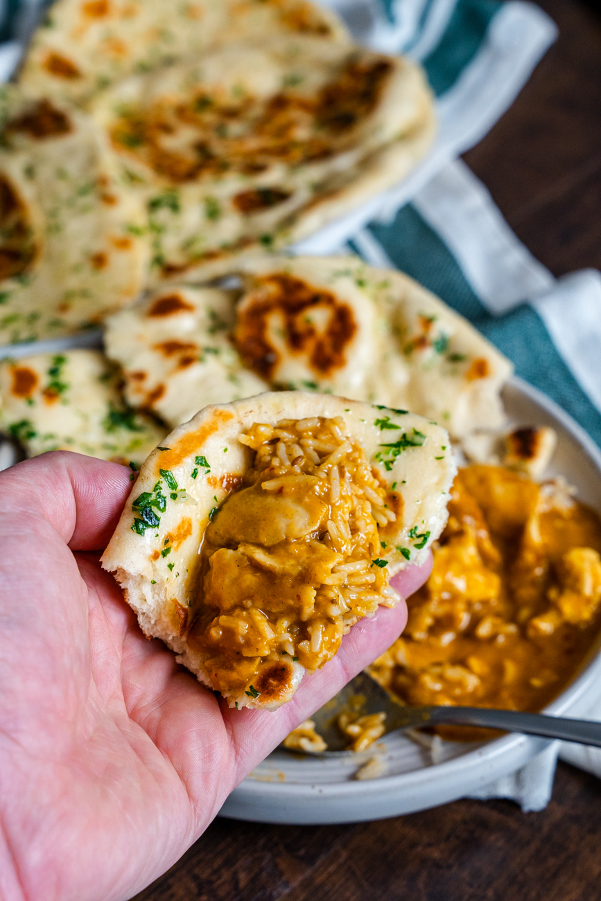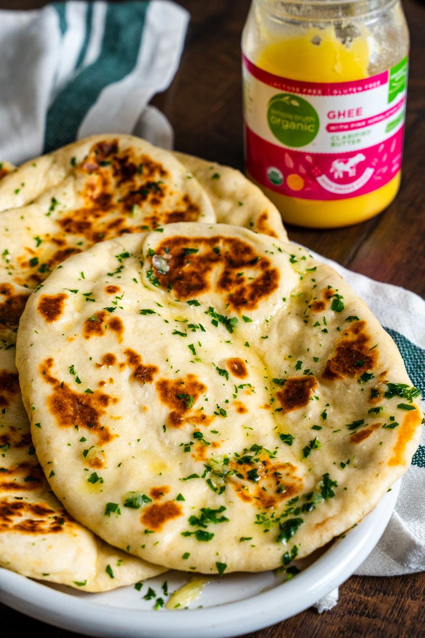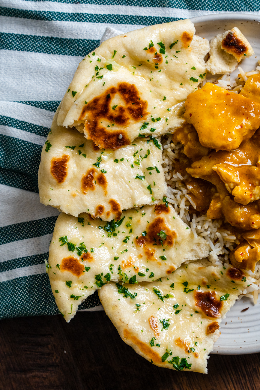 I like to roll naan into an oblong oval shape. The dough should be quite firm making it fairly easy to roll without using any flour. I’m not sure why this shape signifies naan more than any other. It’s the shape I’m used to. Cook the naan in your preheated pan until it starts to bubble on one side, then flip. Brush the cooked side with garlic butter as you continue to let the other side cook for about 1 – 2 minutes. Remove to a plate and cover with foil to keep hot.