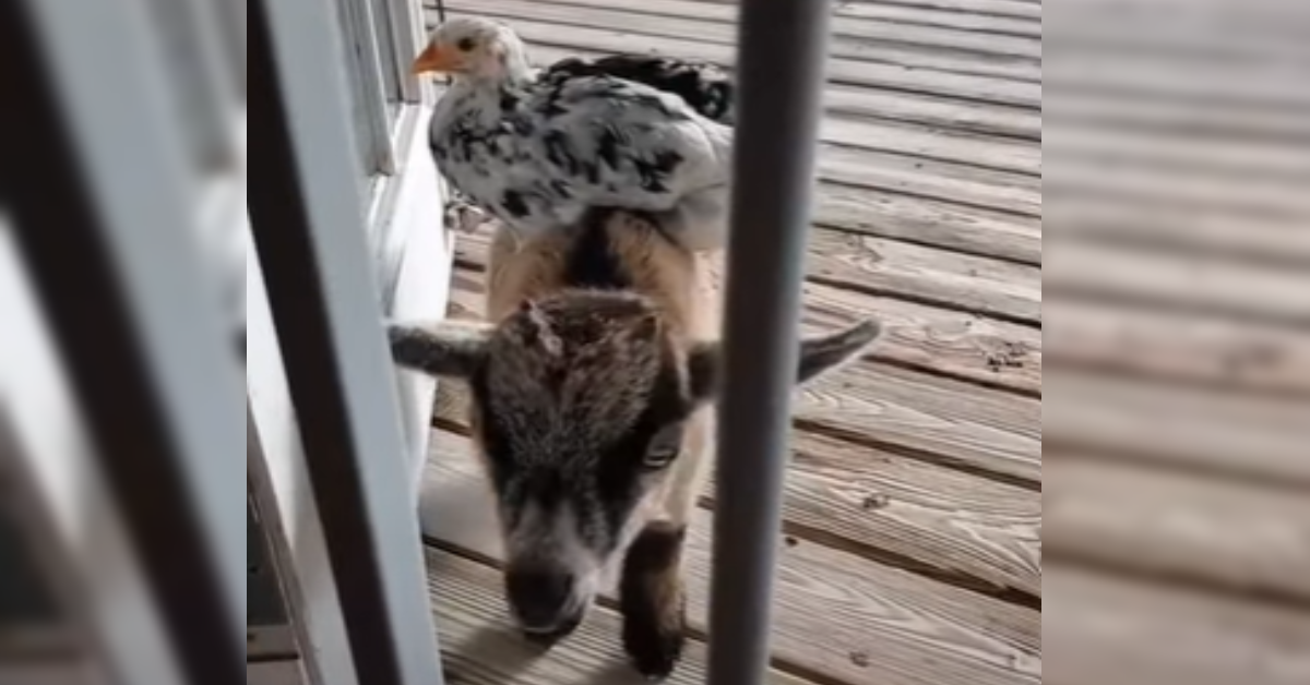 In an adorable video shared on social media, the little goat can be seen walking up to the door with his chicken friend perched on his back.