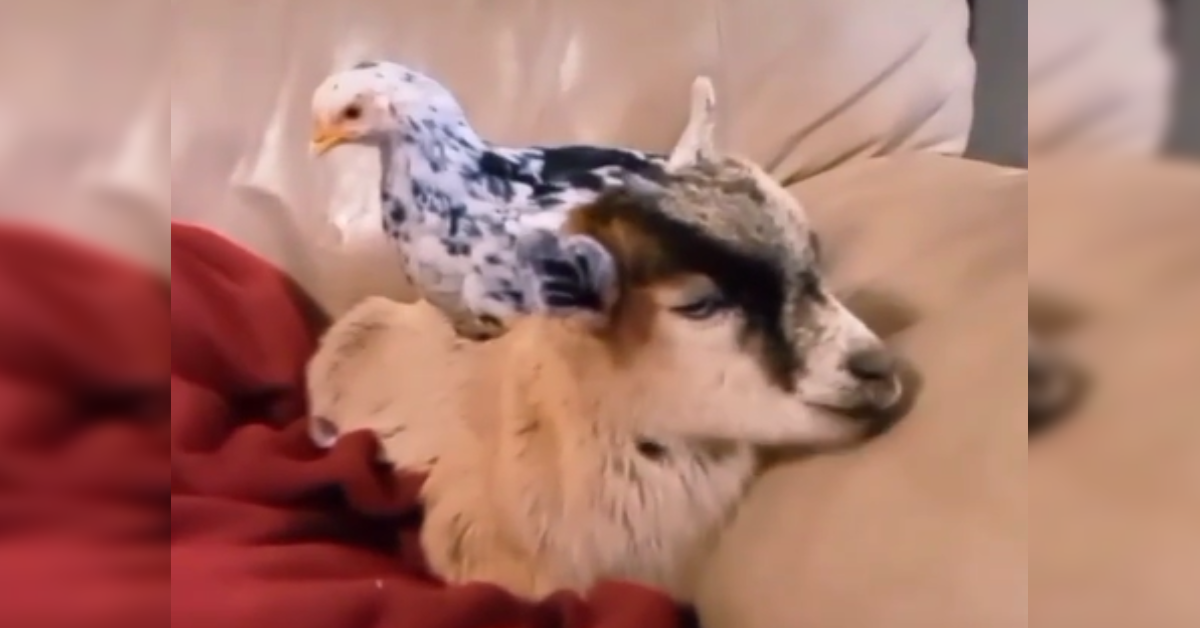 In the video, the goat and chicken happily walk through the door and find a cozy spot on the couch to cuddle up together: