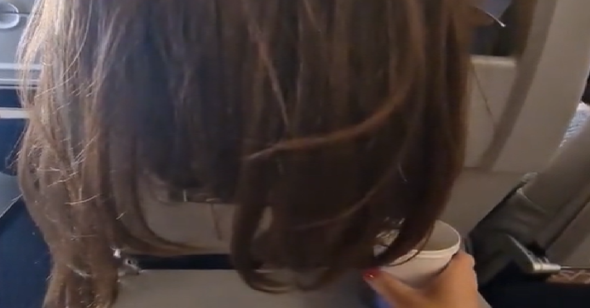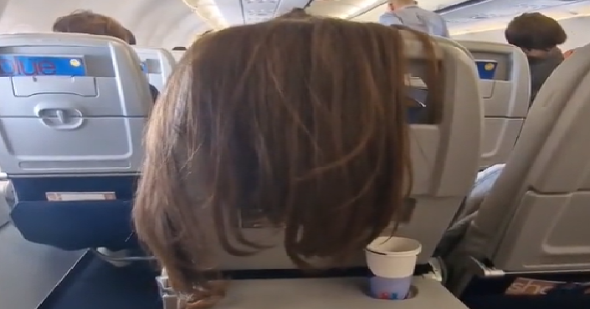 The passenger cannot be seen in the clip Julie shared on TikTok, but her hair can. They have draped their long hair over the back of the seat and now Julie is being forced to deal with it. The hair is so long that it even covers parts of the tray. How on earth could someone do this and not be aware of how annoying they are being?