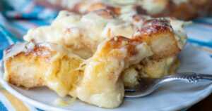 The roots of this dish are a french toast bake – bread-like item, check; egg and milk base, check; fun flavor add-ins, definitely check – but it takes its taste cues from a pastry classic. It’s a scrumptious way to go about serving some ham, eggs, and cheese for breakfast or brunch, that’s for sure!