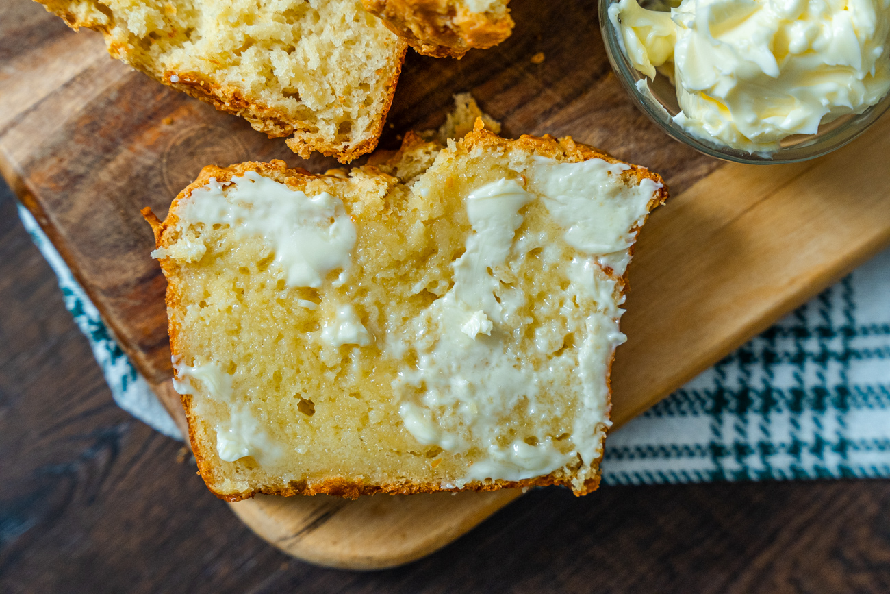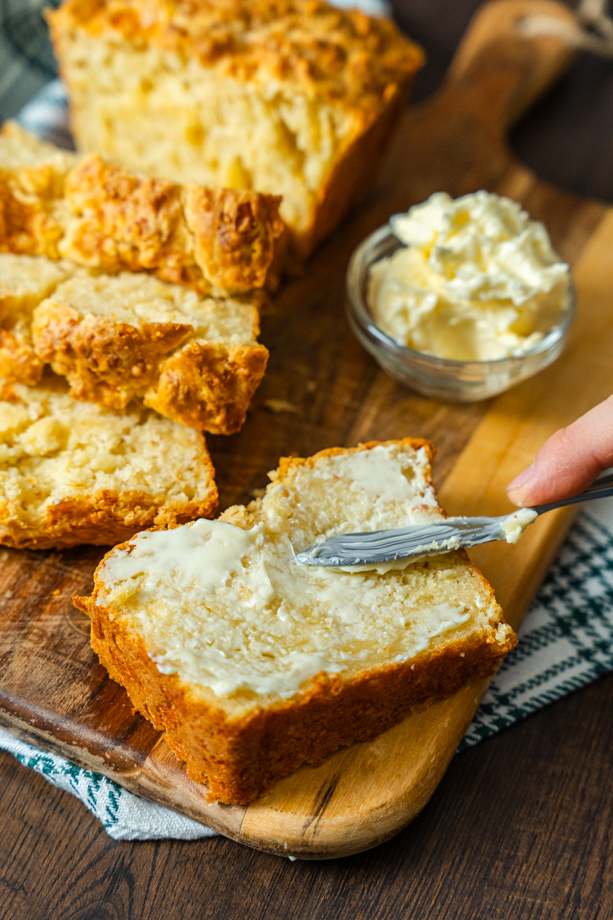 Did you know that if you mix up biscuit dough and scoop it right into a loaf pan you can bake it whole?! No need for all the rolling and cutting – in just 5 minutes you can have this Irish Cheddar Soda Bread in the oven without all the fuss. This extra-cheesy loaf is especially delicious served fresh from the oven topped with butter!