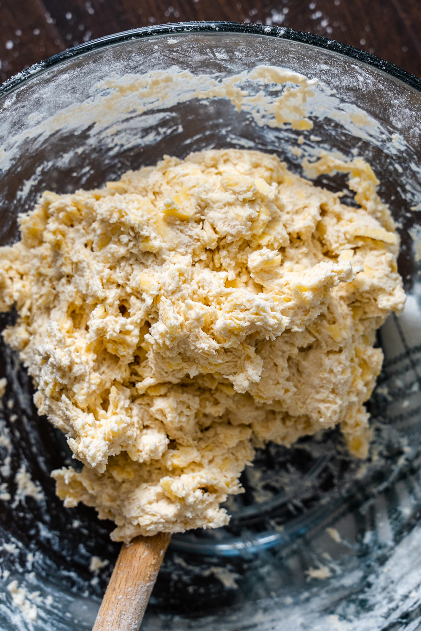 - Add the grated butter (grated cold on a box grater), and use your fingertips or a pastry cutter to cut in the butter until it is the texture of wet sand with pea-sized clumps of butter, then toss in the cheese.