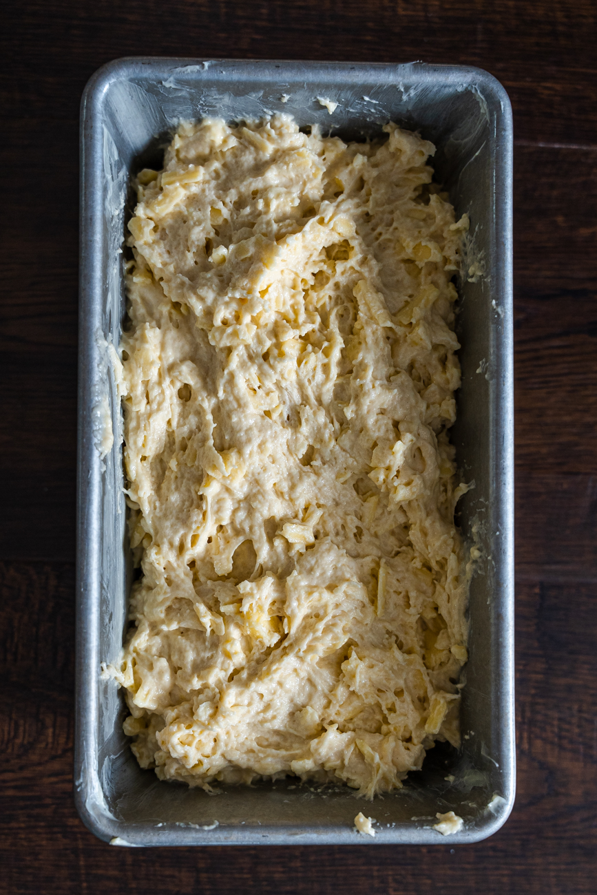 Start off by preheating your oven to 375 degrees and greasing up a standard loaf pan (use butter for best results!). Mix up your dry ingredients in a bowl then add in ice cold butter that’s been grated using a cheese grater and work it into the dry mix with your fingertips or a pastry cutter until the mixture is sandy in texture with little pea-sized bits of butter still visible, then toss in the cheese.