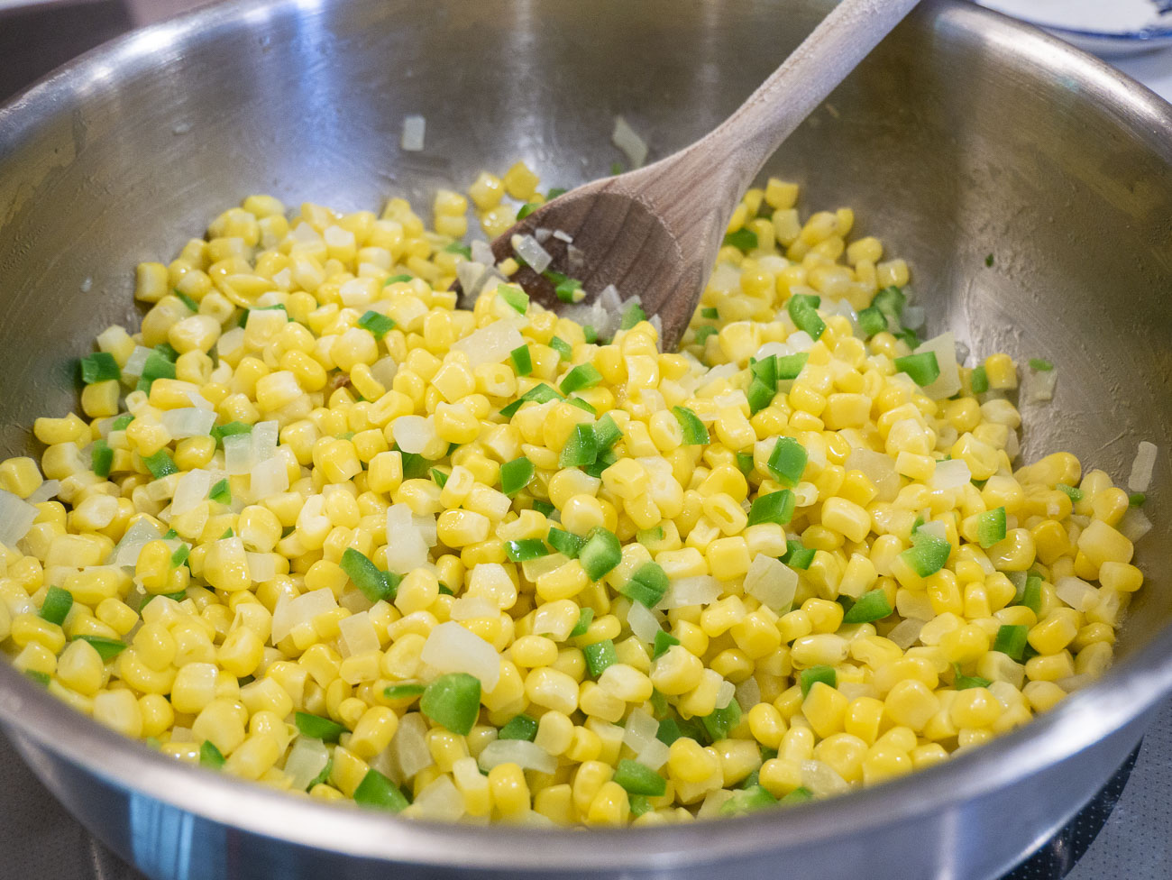 - Stir in corn and continue cooking for about 3 minutes, stirring occasionally. Add jalapeños and cook 5 minutes more.