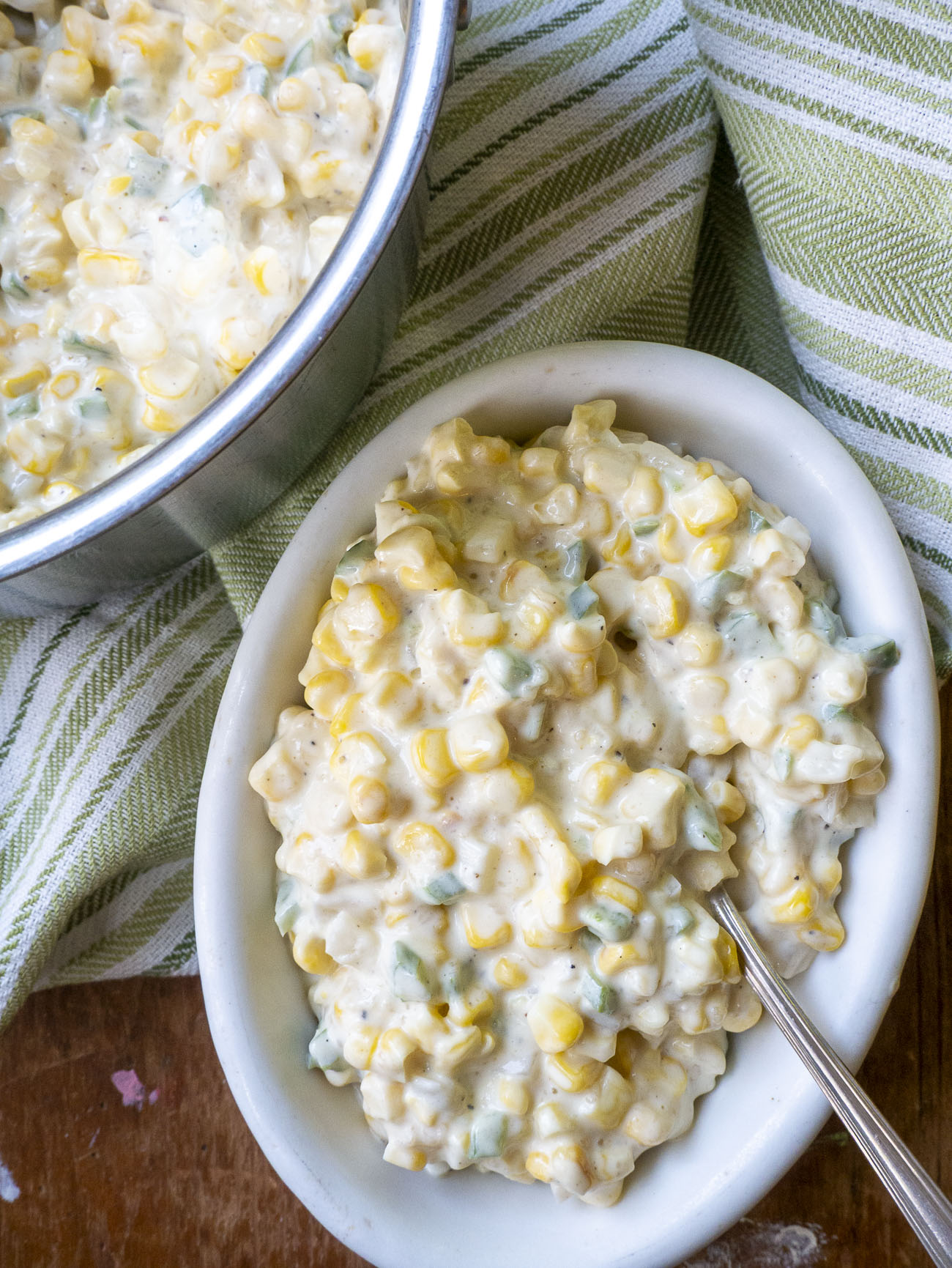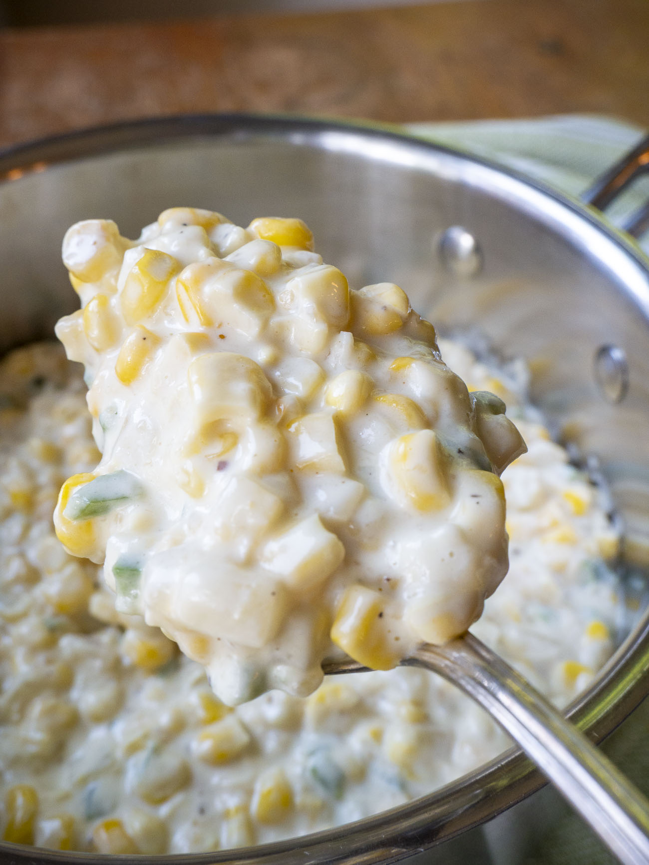 I’m normally not one to seek out spicy stuff but I had some creamed corn similar to this at a barbecue place years ago and it was so delicious that I’ve been trying to recreate it ever since. See, this isn’t spicy, spicy. It just has a little something-something to balance out all that creaminess, which it needs. Because this is indulgent stuff — it’s rich and sooo creamy, but sweet too. And so good that it’s hard to get through cooking it without polishing most of it off before you get it into a serving dish.