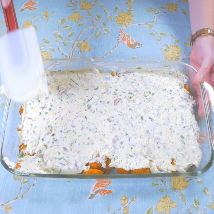 - Remove tater tots from oven and spread cream cheese mixture evenly over the tots, then sprinkle remaining cheese over the top.