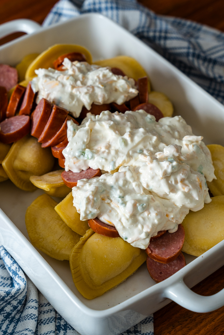 This is kind of one of those ‘dump and bake’ situations, so you have little more to do than layer and stir. To start with, you want to slice up that kielbasa and get it into a 9×13 along with the pierogis. You don’t need to thaw them and you can use any flavor you like!