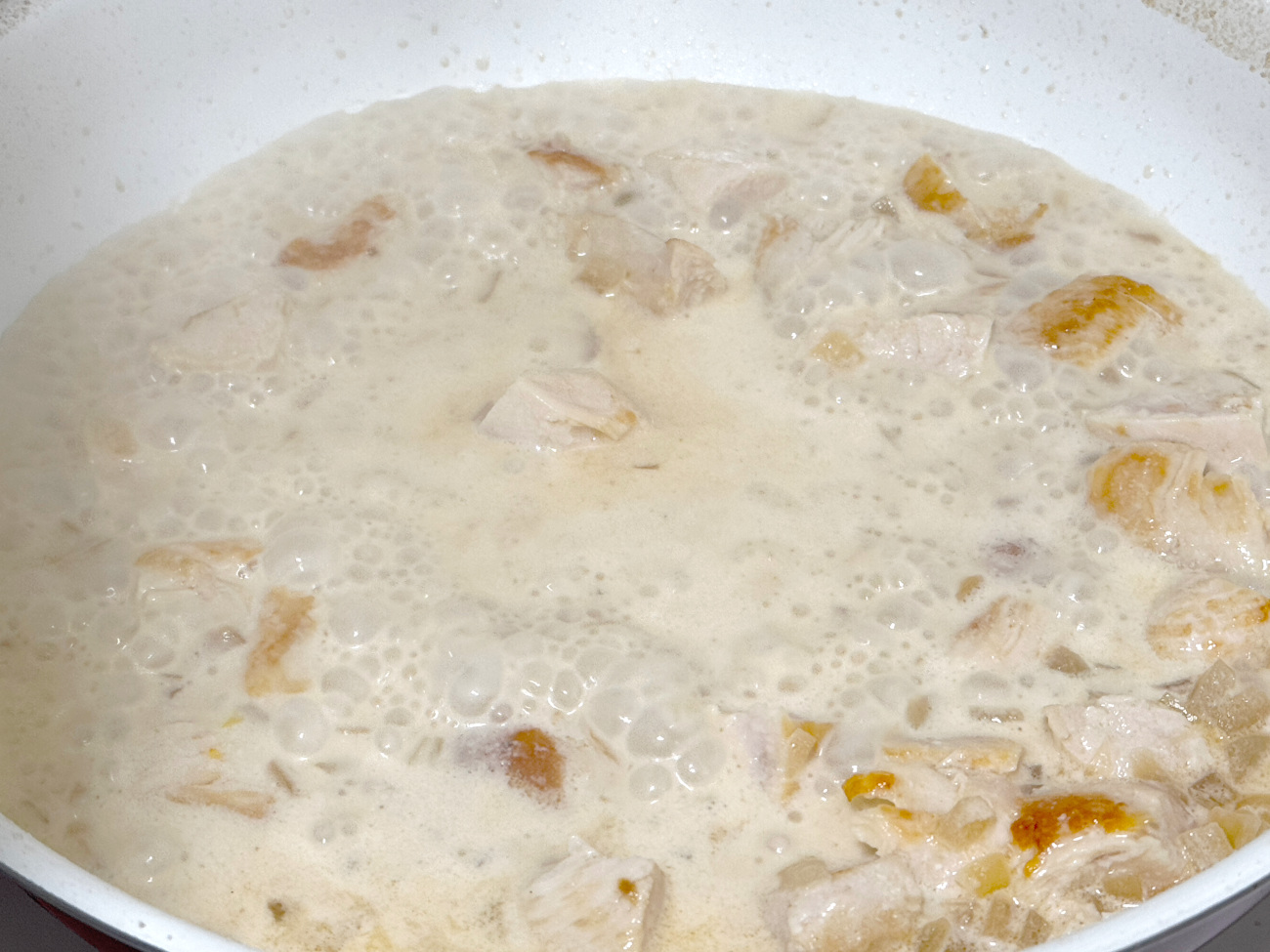 After the pasta is cooked, the same pot is reheated with a bit of olive oil, and the chicken is seared until golden on the outside and cooked on the inside. Next, more oil is added, and the aromatics — onion and garlic — are cooked until tender and fragrant. Once cooked through, the liquids of the dish — cream, stock, and lemon juice — join forces with lemon zest and Parmesan cheese to make a dish that’s smooth, creamy, and complex.