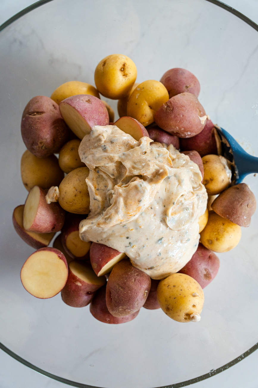 After the potatoes are prepped, the mayonnaise sauce is mixed up with dried parsley, onion, garlic, paprika, salt, and pepper. The sauce and potatoes are mixed together.