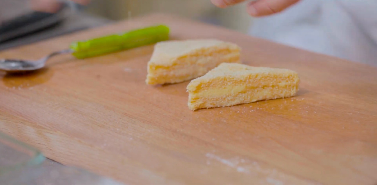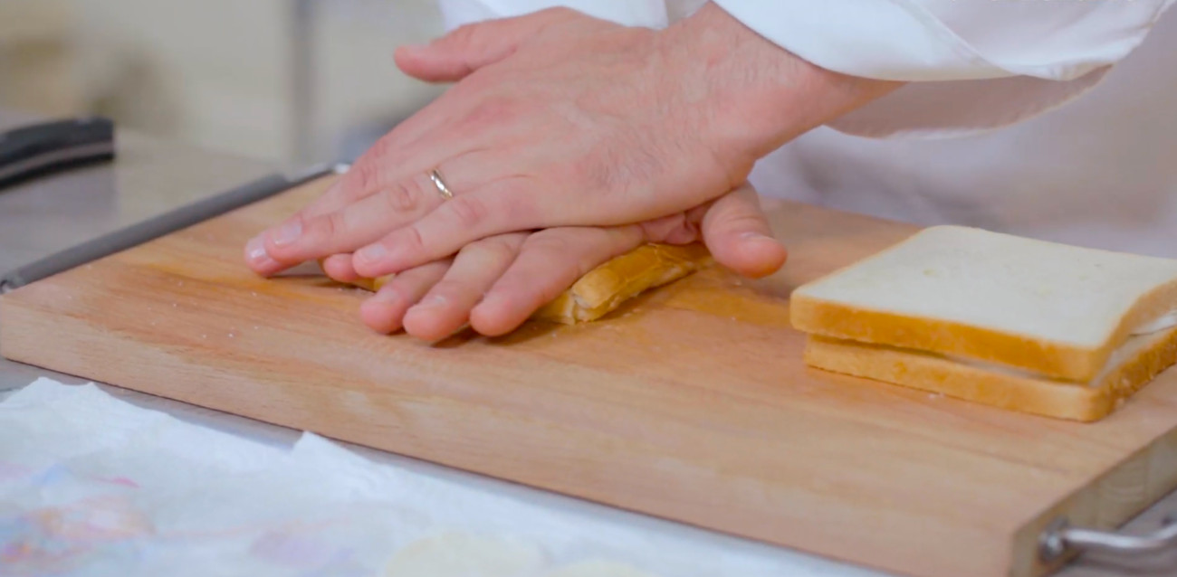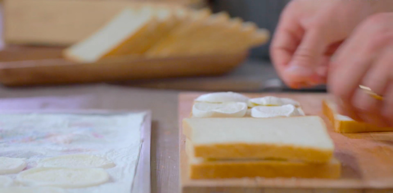With slices of bread and mozzarella, Andrea goes about assembling the sandwiches. Once built he flattens the sandwich down, creating a seal. After trimming the crust and cutting the sandwiches into squares and triangles, he refrigerated the sandwiches to firm them up.