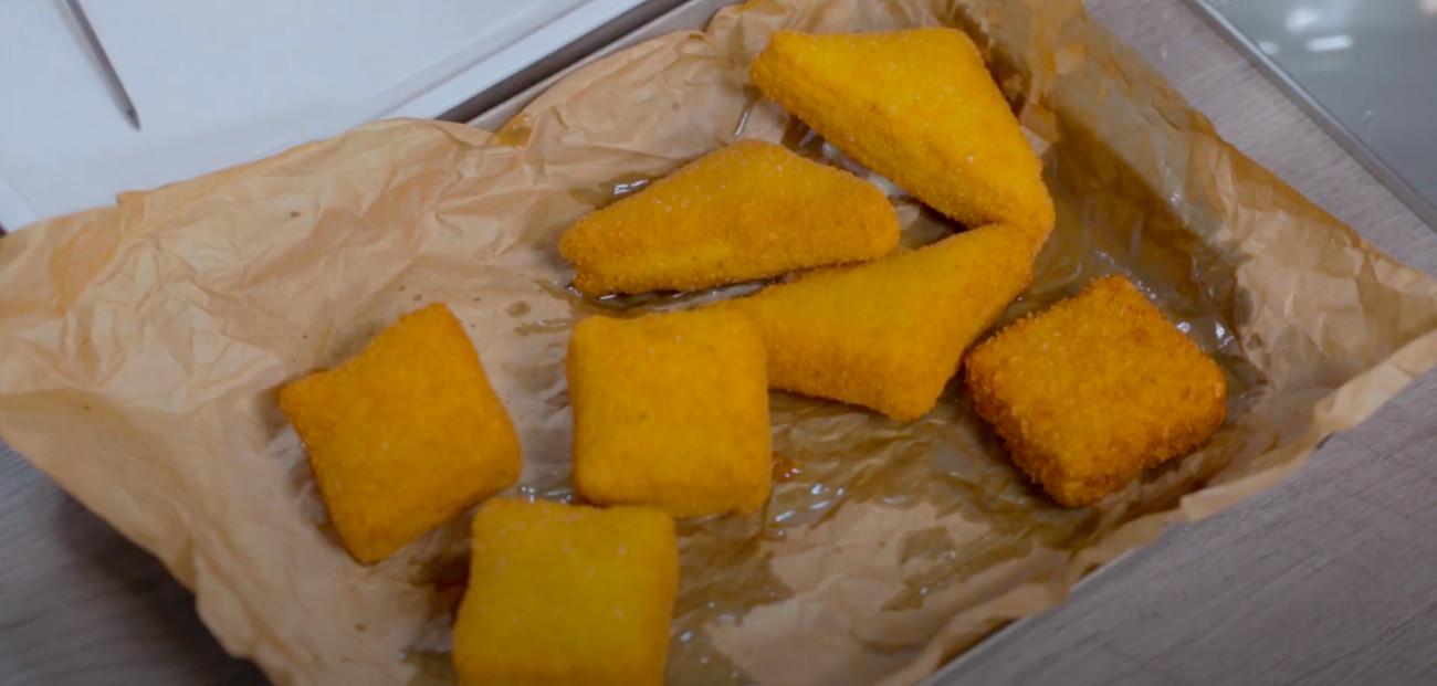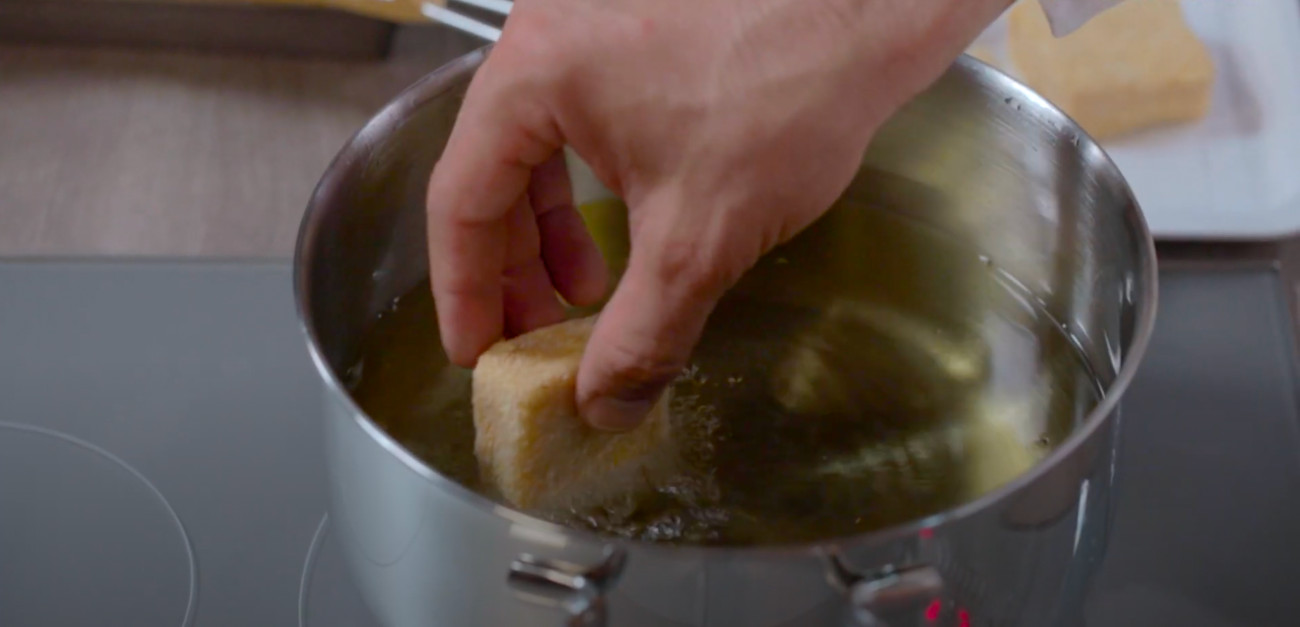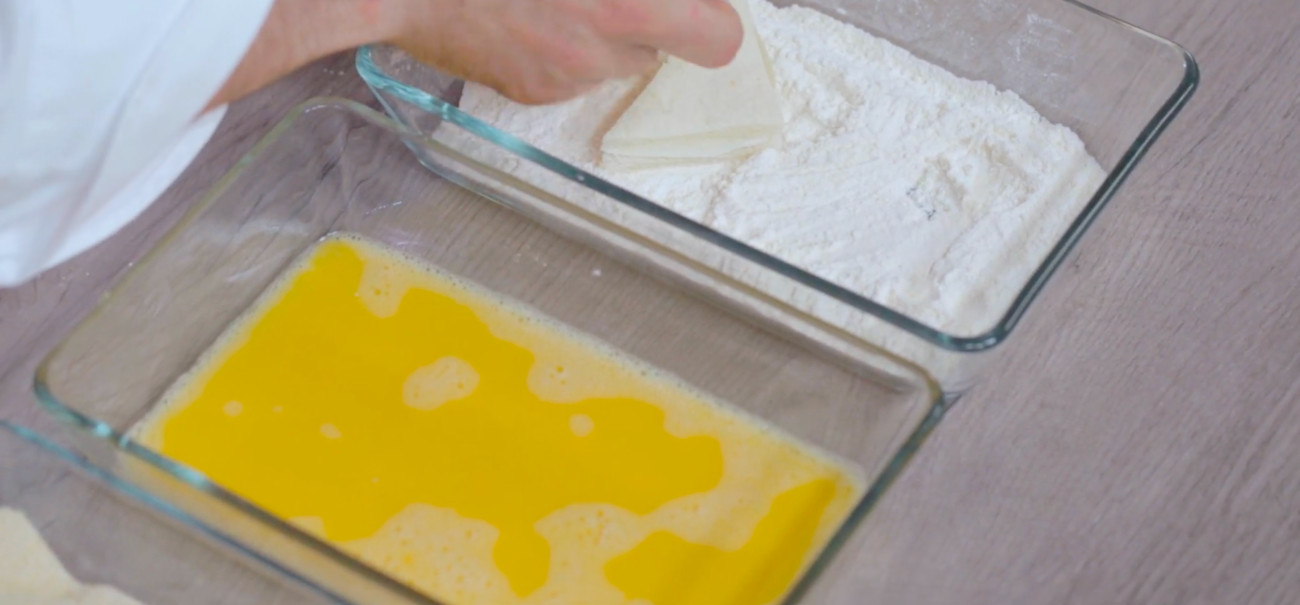 Once the cheese’s moisture has slightly evaporated, the sandwiches get a dip into flour, beaten eggs, and bread crumbs.