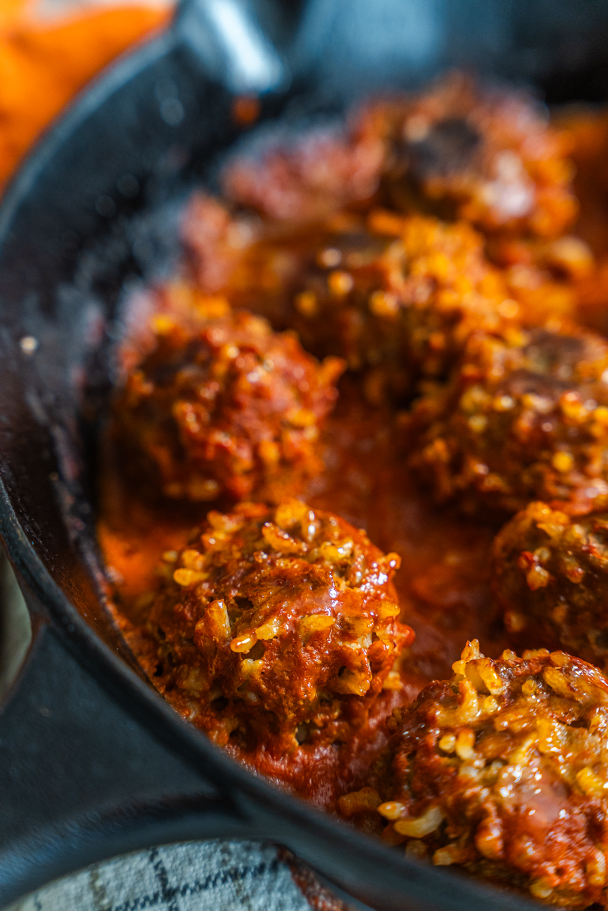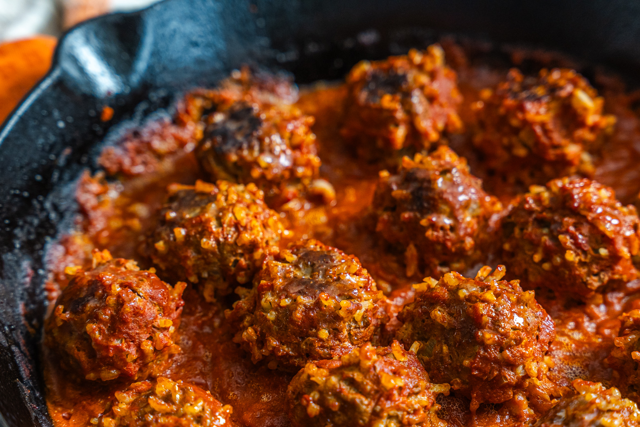 Place those meatballs into a cold skillet. Odd, I know. But we don’t want to sear them off and prevent the rice from doing its porcupine thing… we’re just going to braise these meatballs. So get them all into the skillet and then whisk together the tomato sauce with a bit of water and a dash of Worcestershire sauce and then pour that mixture over and around the meatballs.
