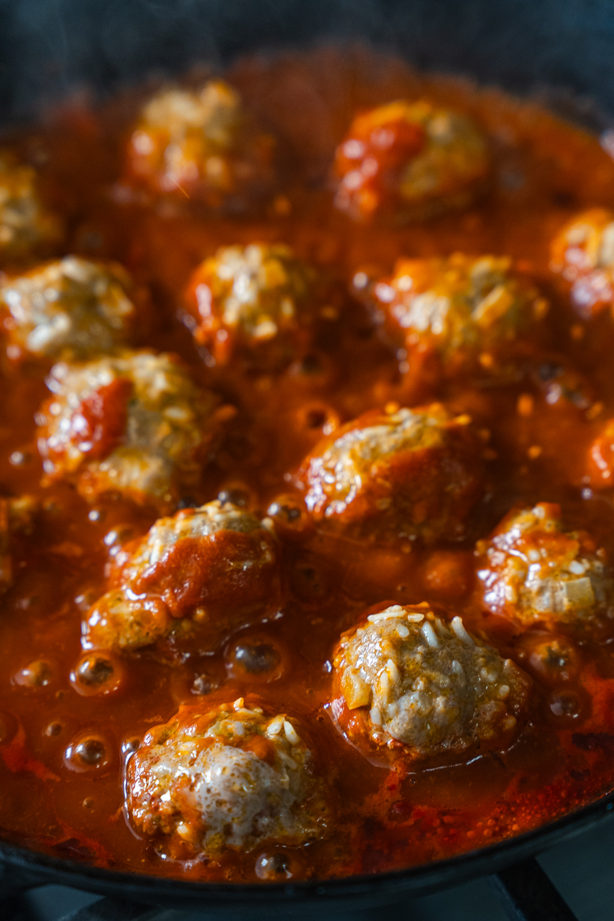 Then you can turn on the heat. Bring it to a boil, then cover the pan and reduce it to a nice simmer. Give it about twenty minutes, then flip those meatballs over gently, recover, and give it about twenty minutes more.