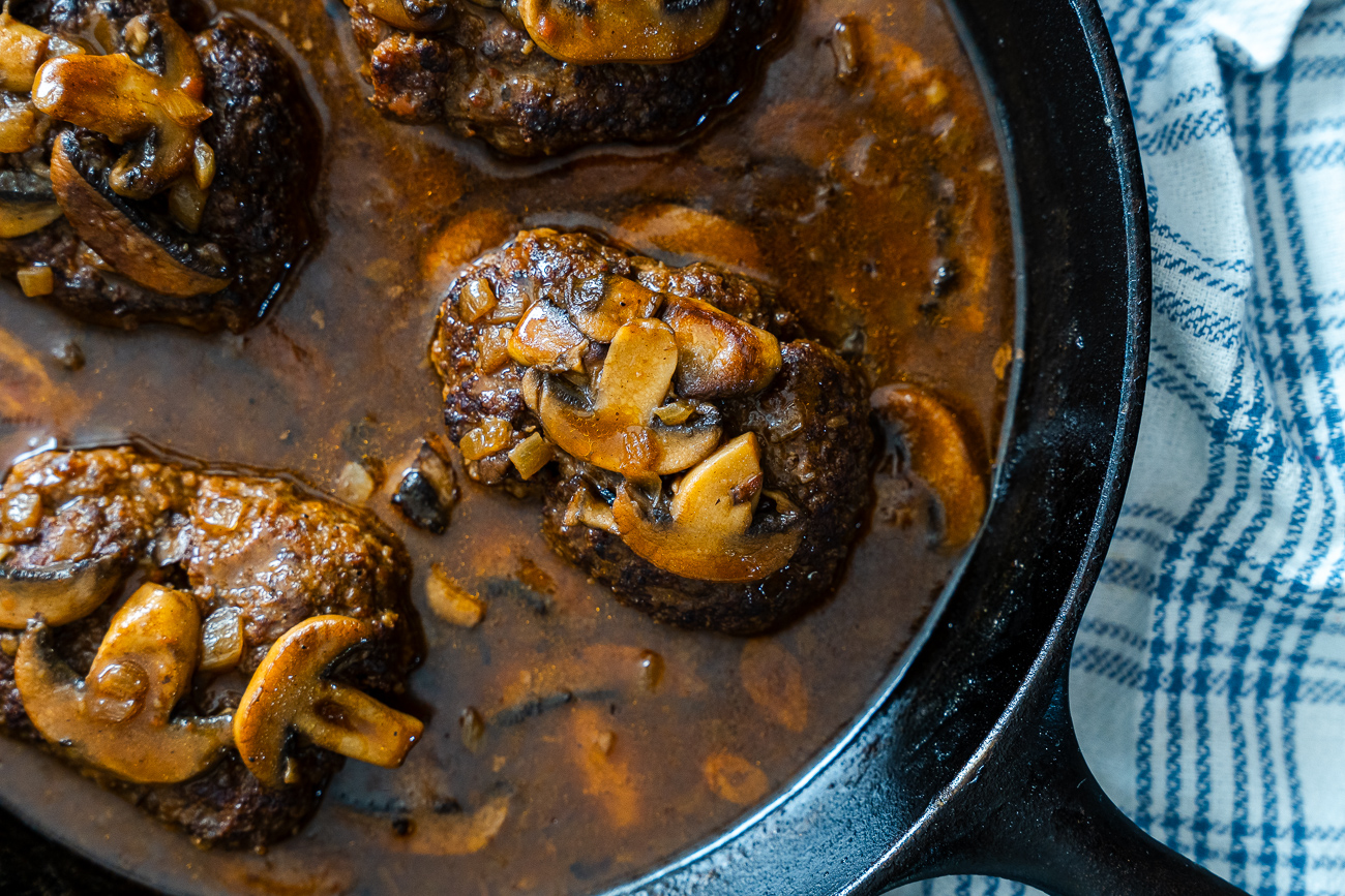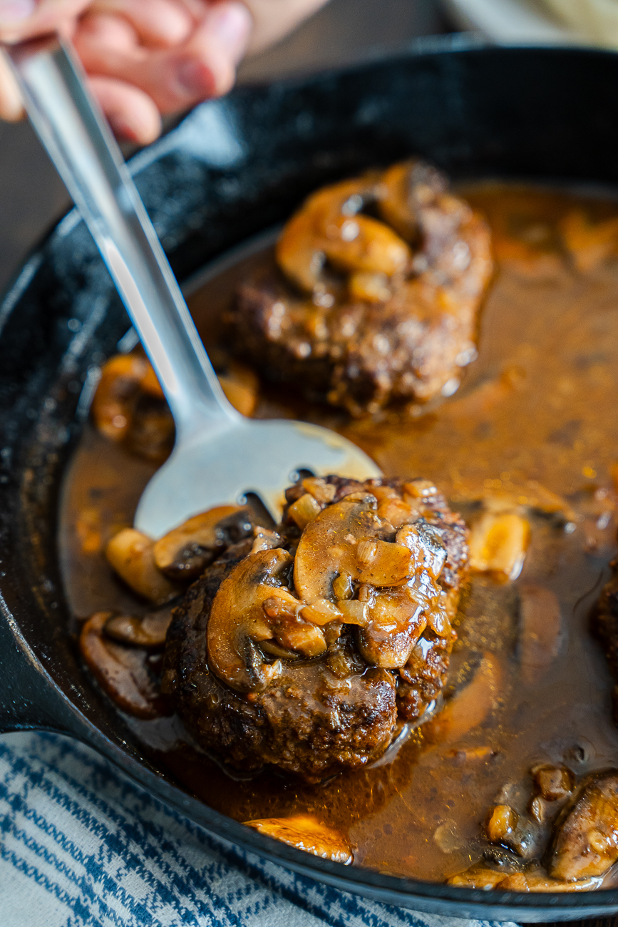 Old-Fashioned Salisbury Steak is comfort at its peak. A seasoned mixture of ground beef sears up in a cast iron skillet and then simmers in a from-scratch mushroom gravy until it melts away into meaty perfection.