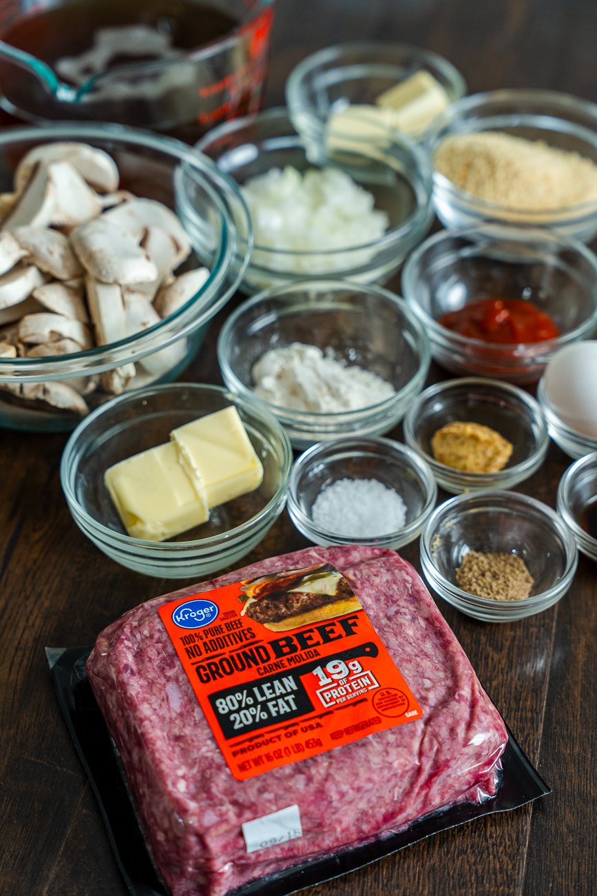After the patties get a good sear, sliced mushrooms and onions make their way into the skillet. Flour, ketchup, broth, and Worcestershire sauce provide savory notes to the gravy and create a great smooth thickness.