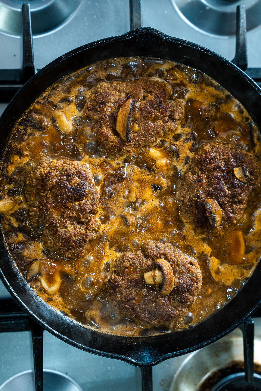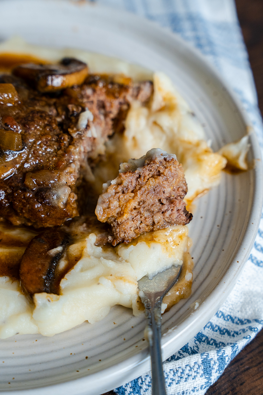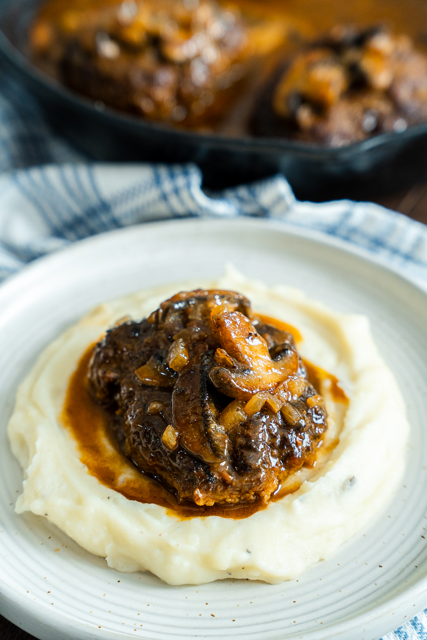 You can serve this straight from the skillet or piled onto a mountain of mashed potatoes. The savory gravy and tender meat, those earthy mushrooms…should be salivate stake, not salisbury steak.