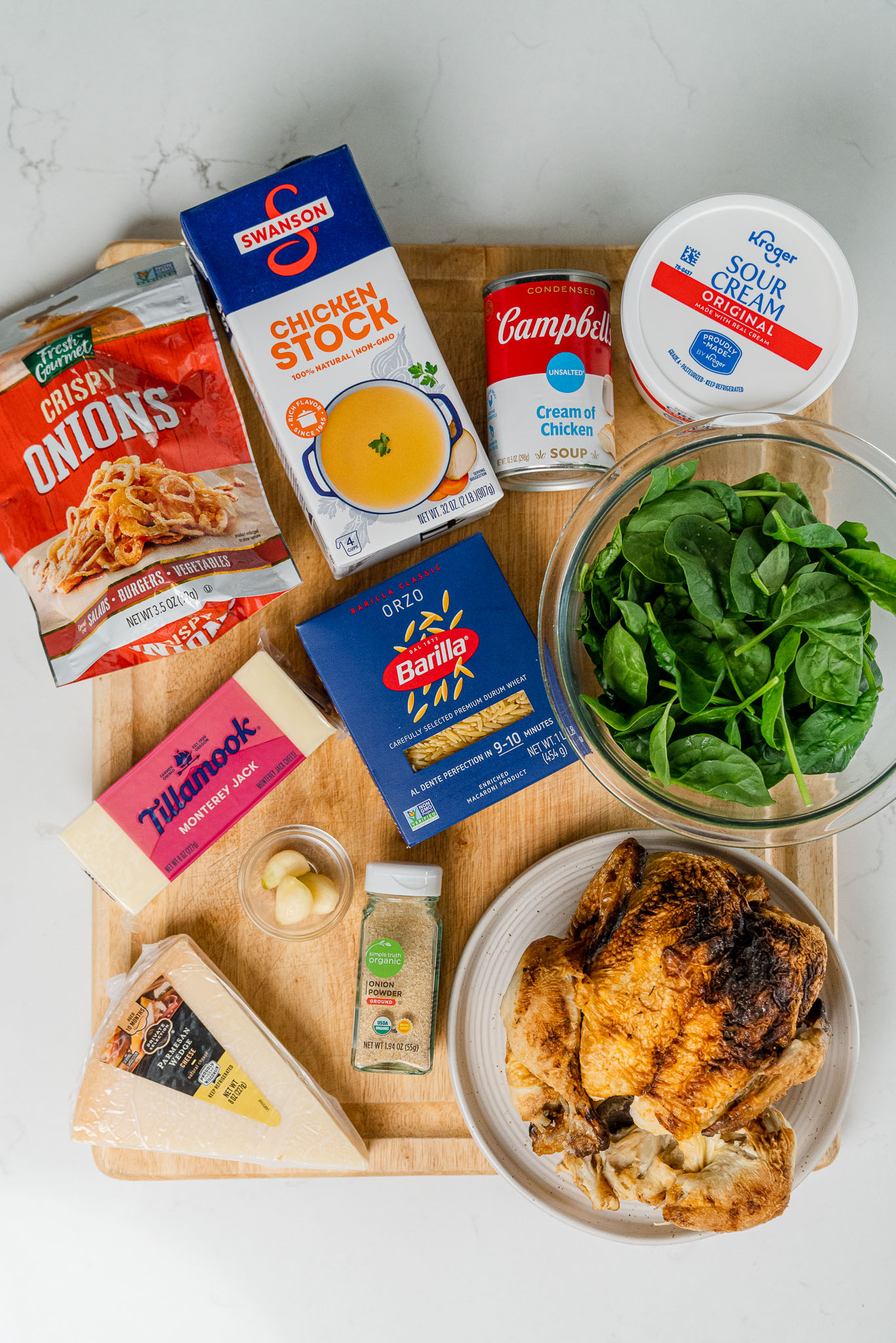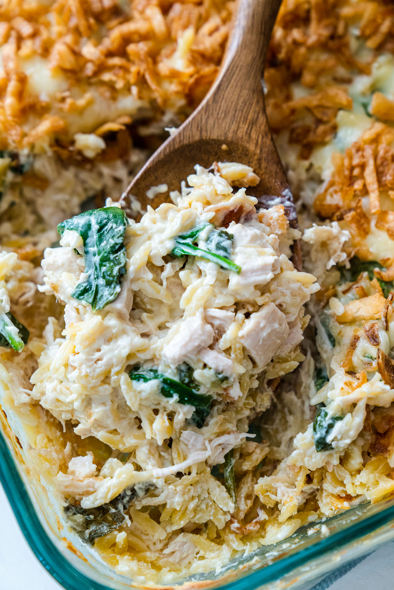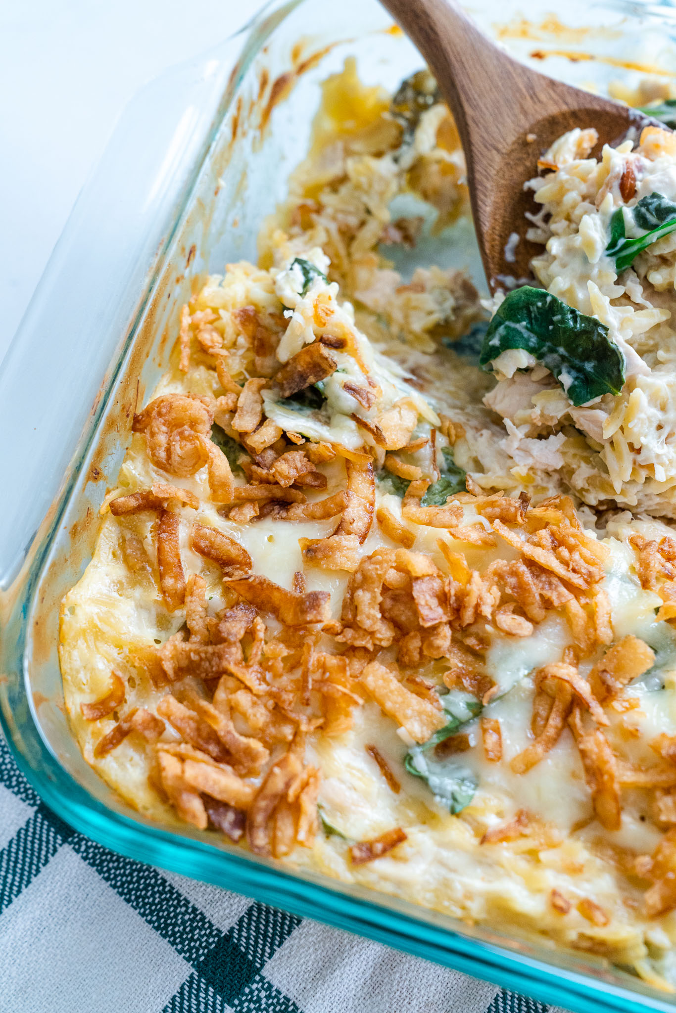 - In a mixing bowl or directly in the prepared baking dish, stir together the chicken soup, sour cream and chicken broth. Add garlic, onion powder, spinach, orzo, chicken, and 1 1/2 cups of the Monterey Jack, 1/4 cup of the Parmesan, and half of the French fried onions.