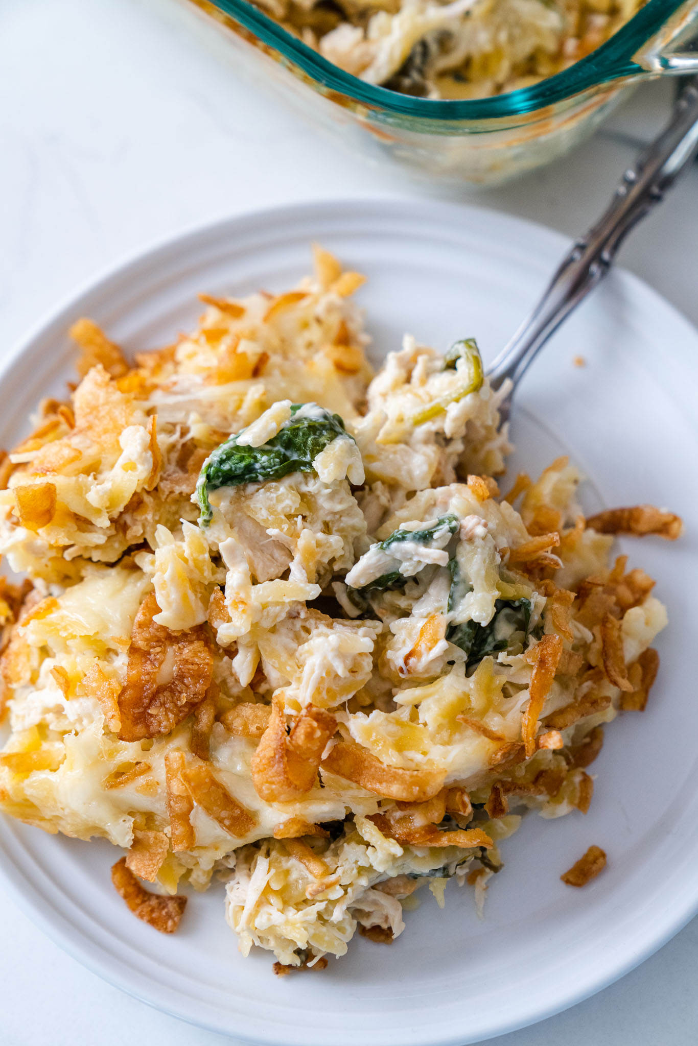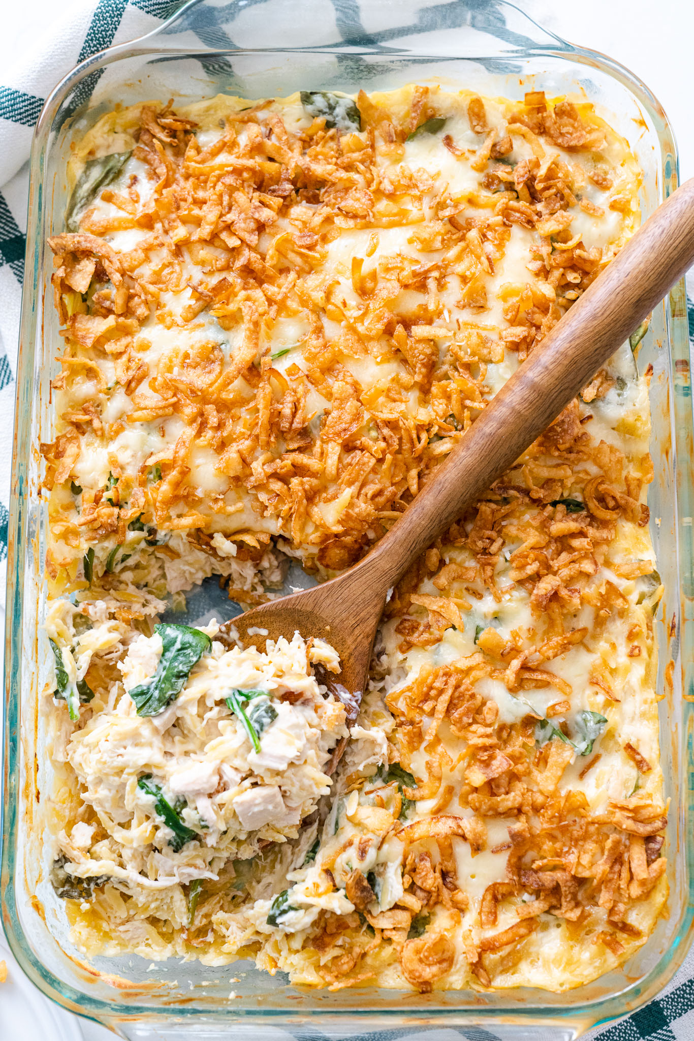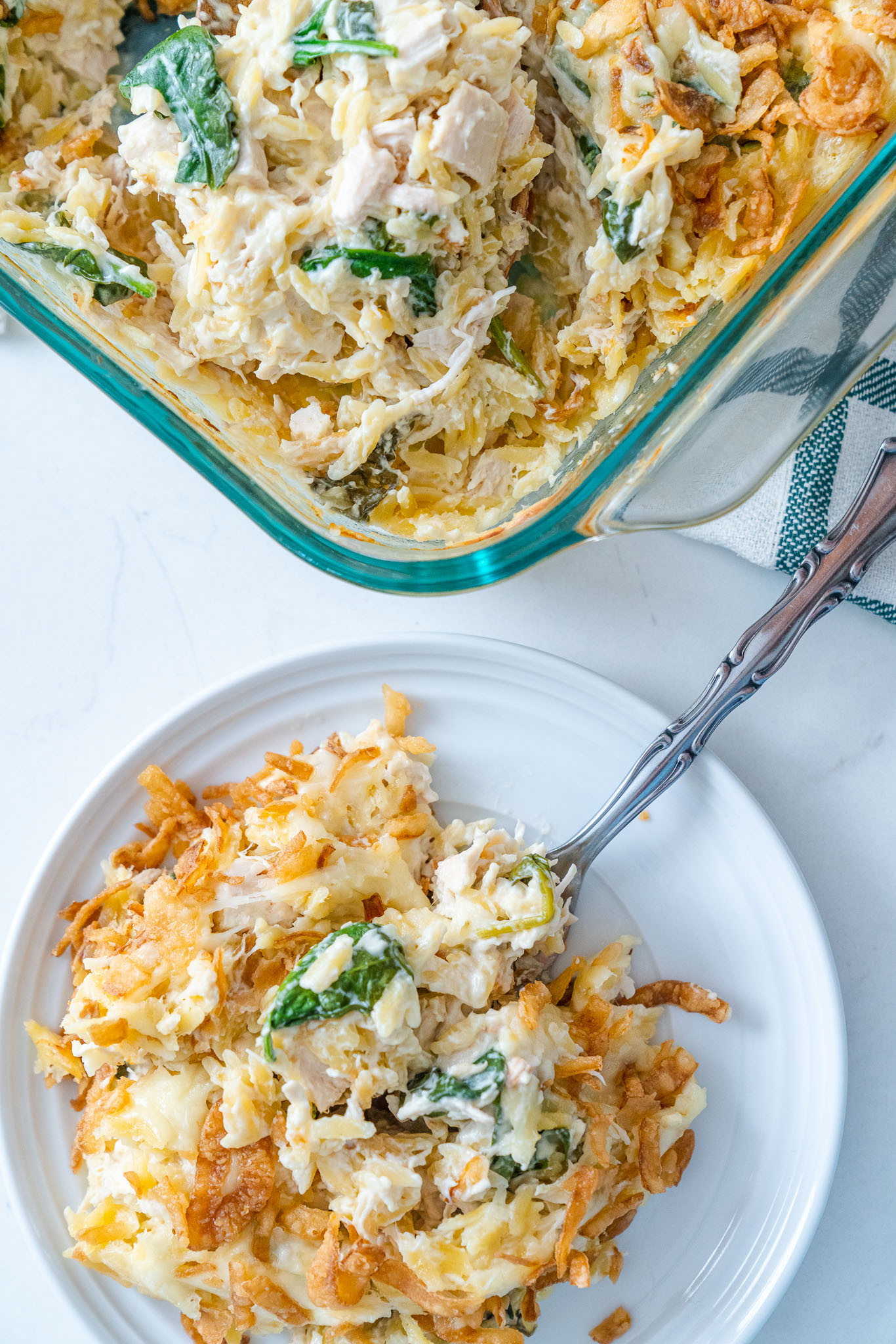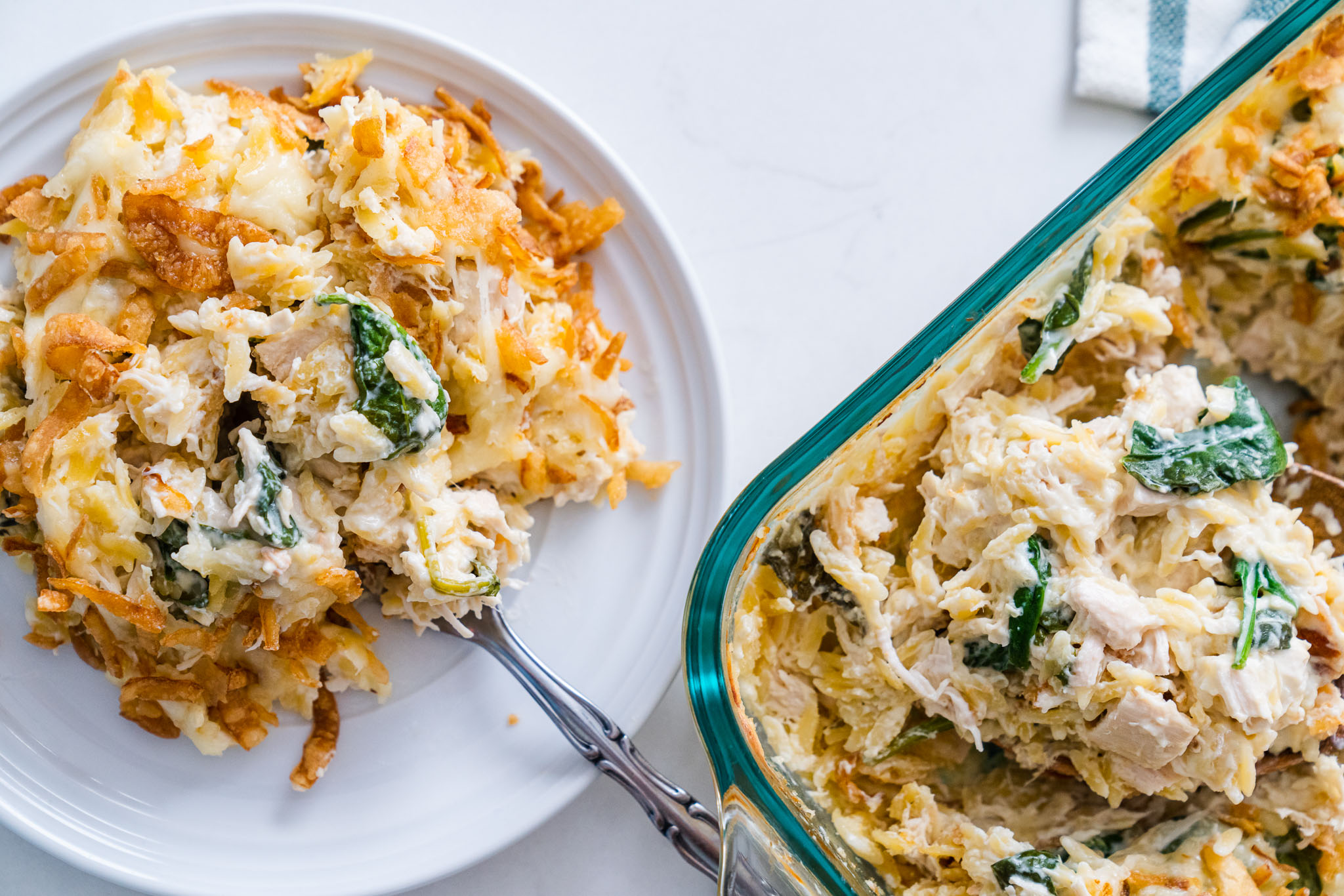 - In a mixing bowl or directly in the prepared baking dish, stir together the chicken soup, sour cream and chicken broth. Add garlic, onion powder, spinach, orzo, chicken, and 1 1/2 cups of the Monterey Jack, 1/4 cup of the Parmesan, and half of the French fried onions.