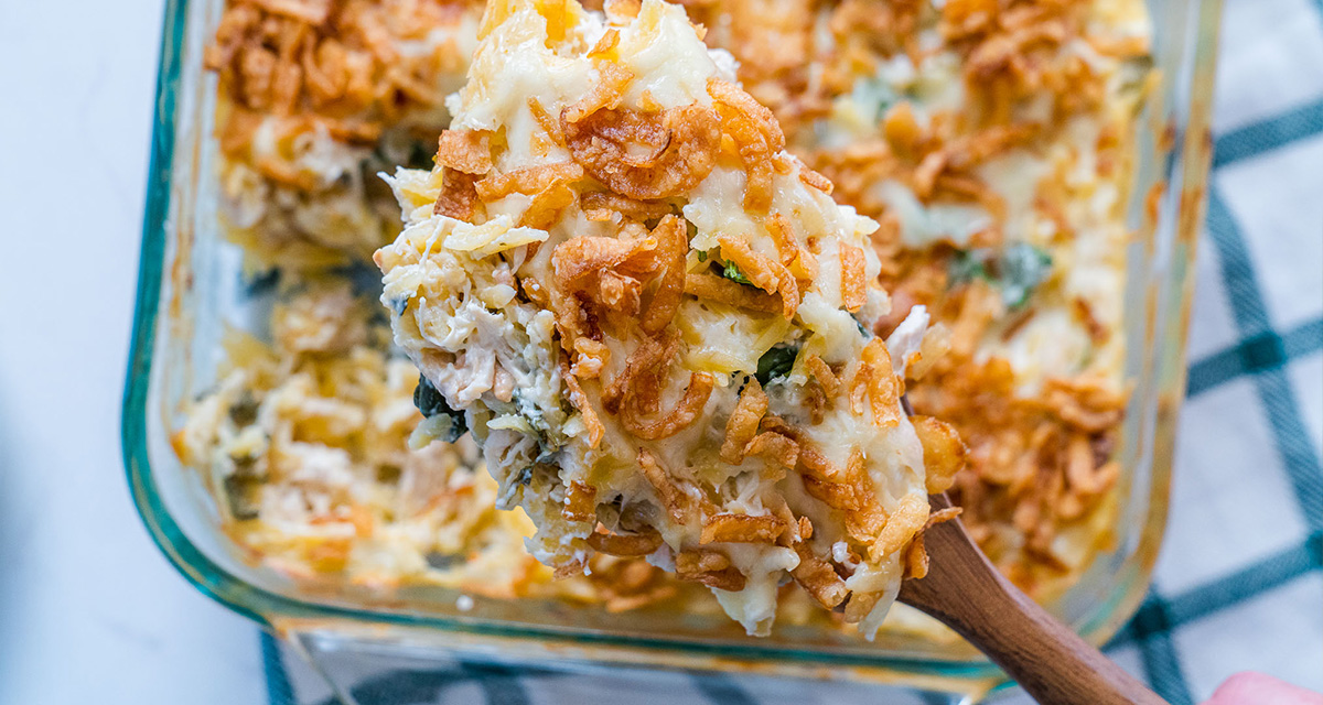So get a 9×13 baking dish ready. Then go ahead and stir together the sour cream, chicken soup, and chicken broth. Mix in everything else, reserving some of the cheese and the fried onions for the top, and then cover it with foil.