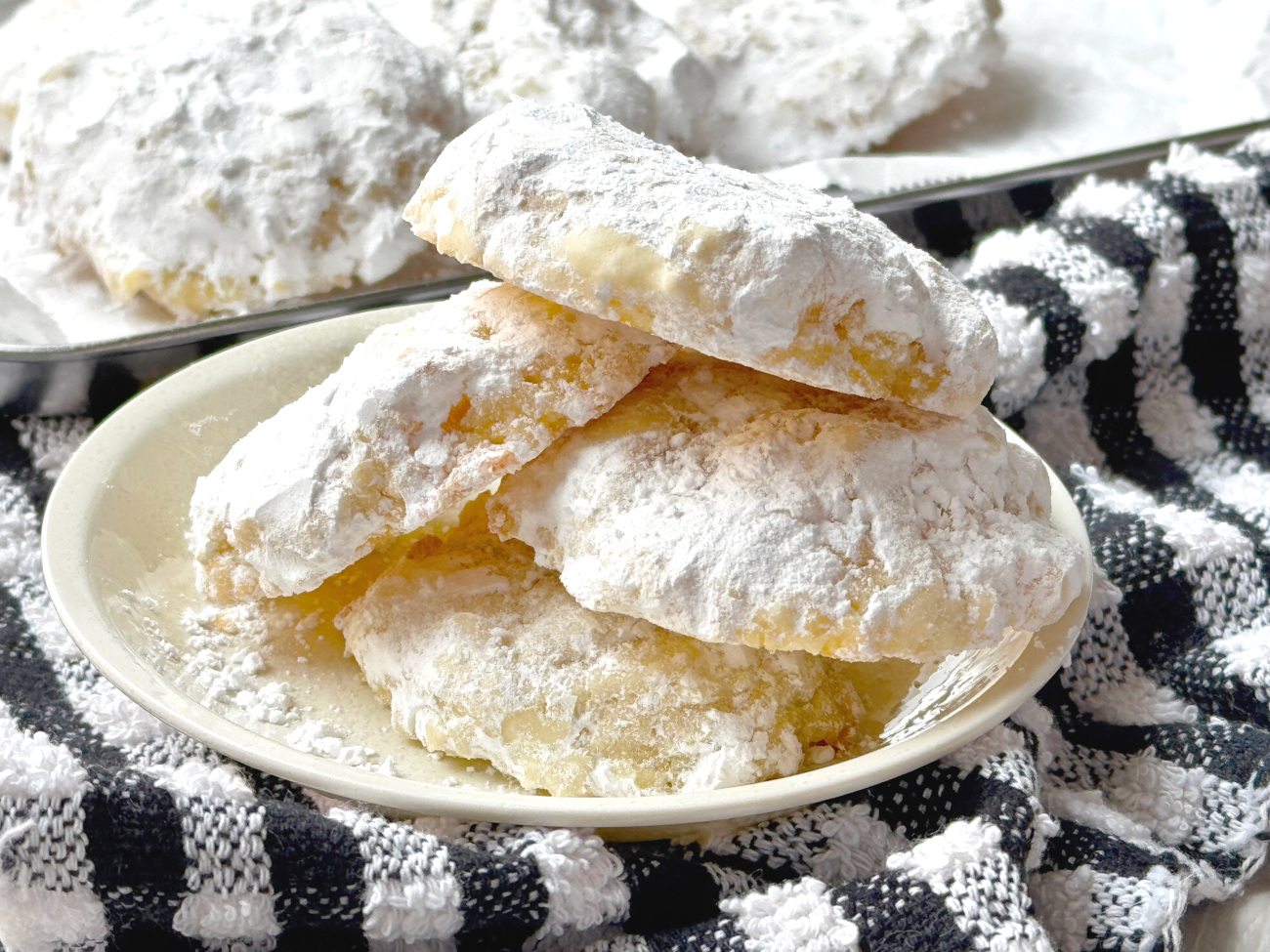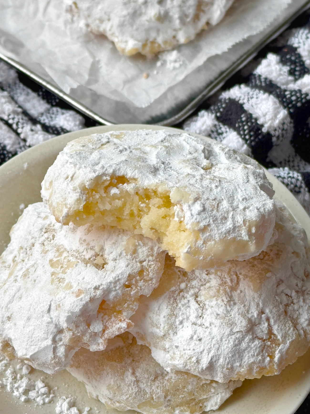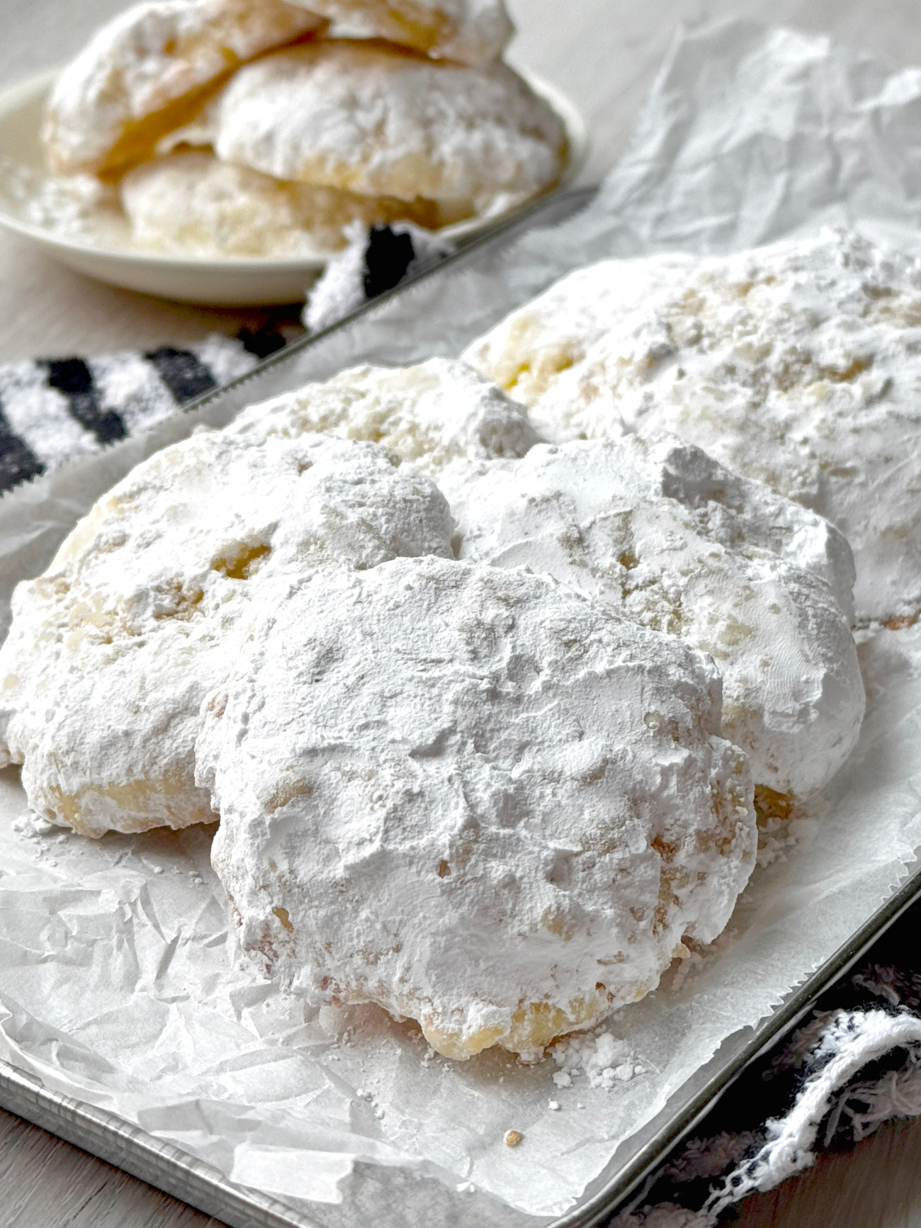 The dough is divided, rolled, flattened, and baked until the edges are just starting to brown. After the cookies have cooled, they get tossed in powdered sugar for a nice snowy effect.