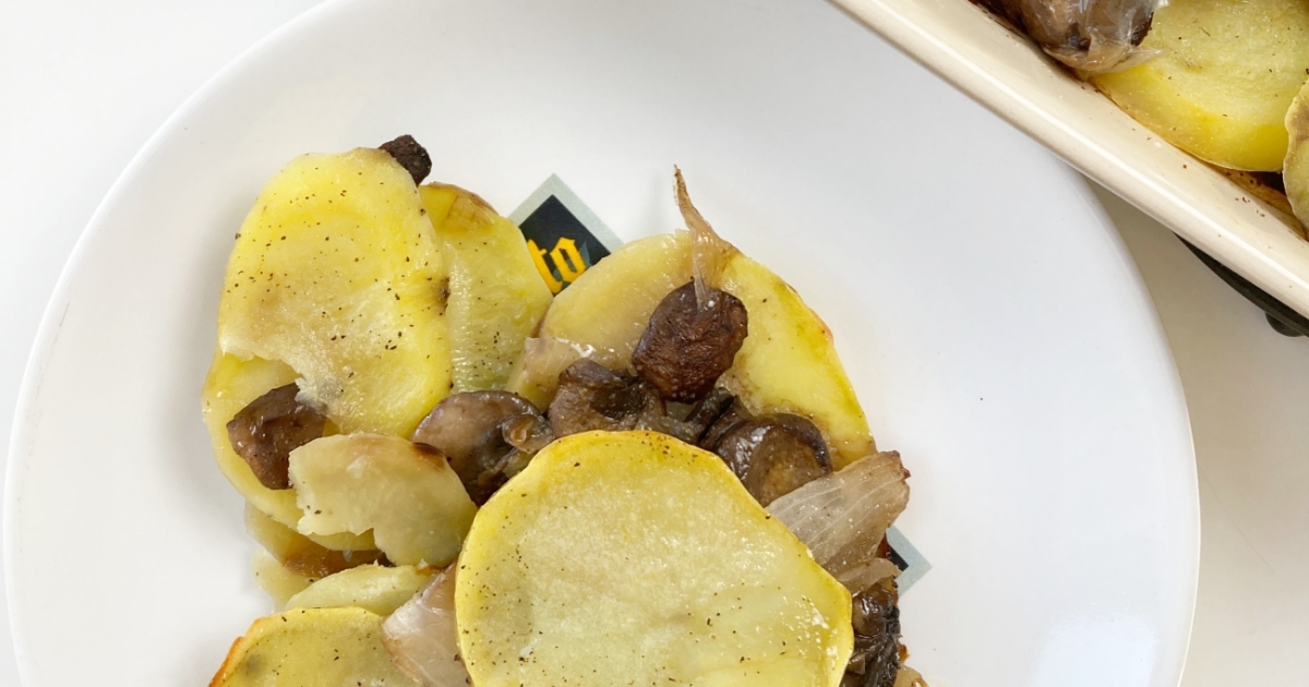 To make these tasty potatoes you peel and then slice the taters thin, like you would for scalloped potatoes. But, instead of a creamy sauce, this recipe calls for the potatoes to be layered with caramelized onions and mushrooms.