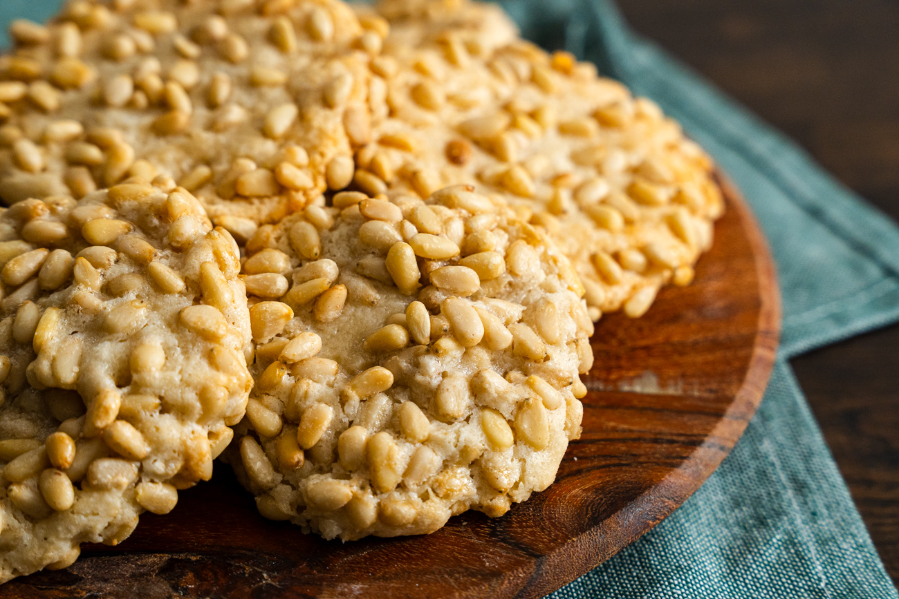 Four essential ingredients (plus a couple extra for texture) make the cookie, with the two hallmark ingredients being almond paste and pine nuts. These two ingredients are well known in Southern Italy, where these cookies first originated. Sicilian cooking made frequent use of almond paste in both sweet and savory dishes, and in this recipe, it helps to create a creamy batter that becomes a chewy cookie.