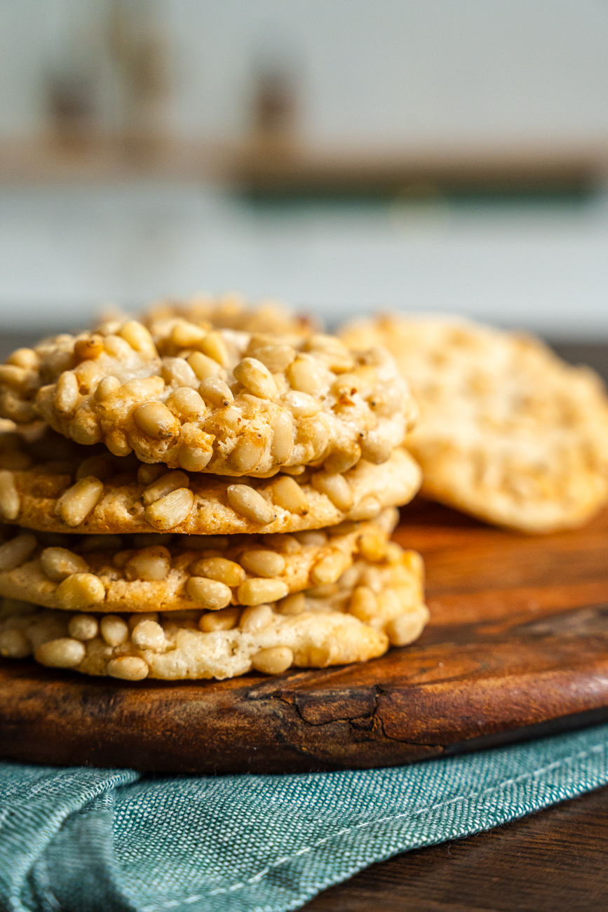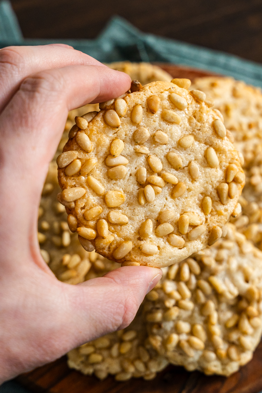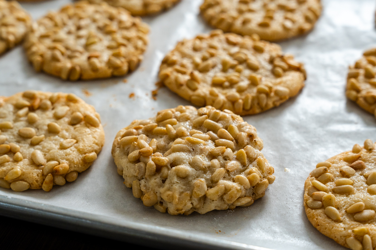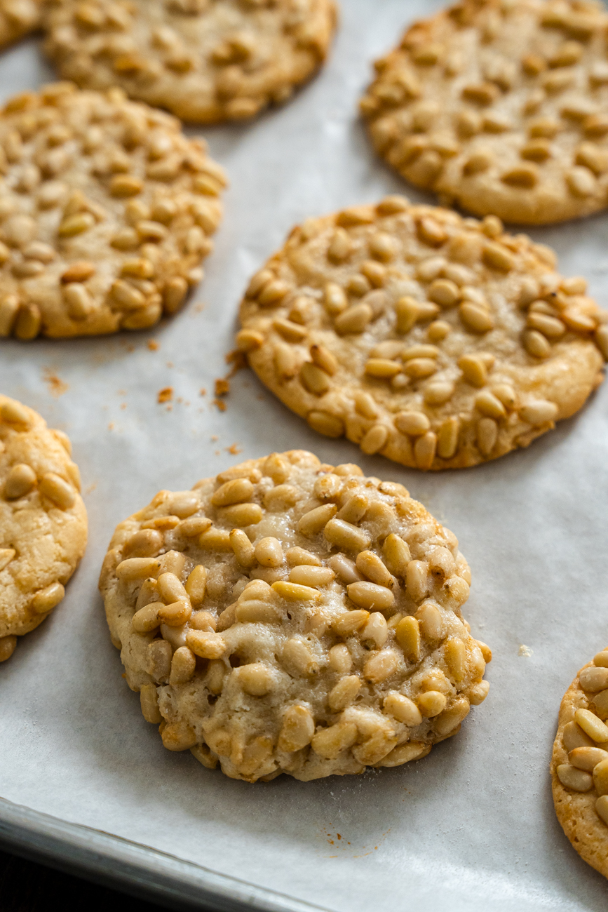The pine nuts, already known for their pop of nuttiness, become a beautiful golden brown in the oven. That toasty, nutty flavor pairs beautifully with the lightly sweet almond flavor of the cookie, so the cookie is crunchy and chewy, savory with just the right sweetness.