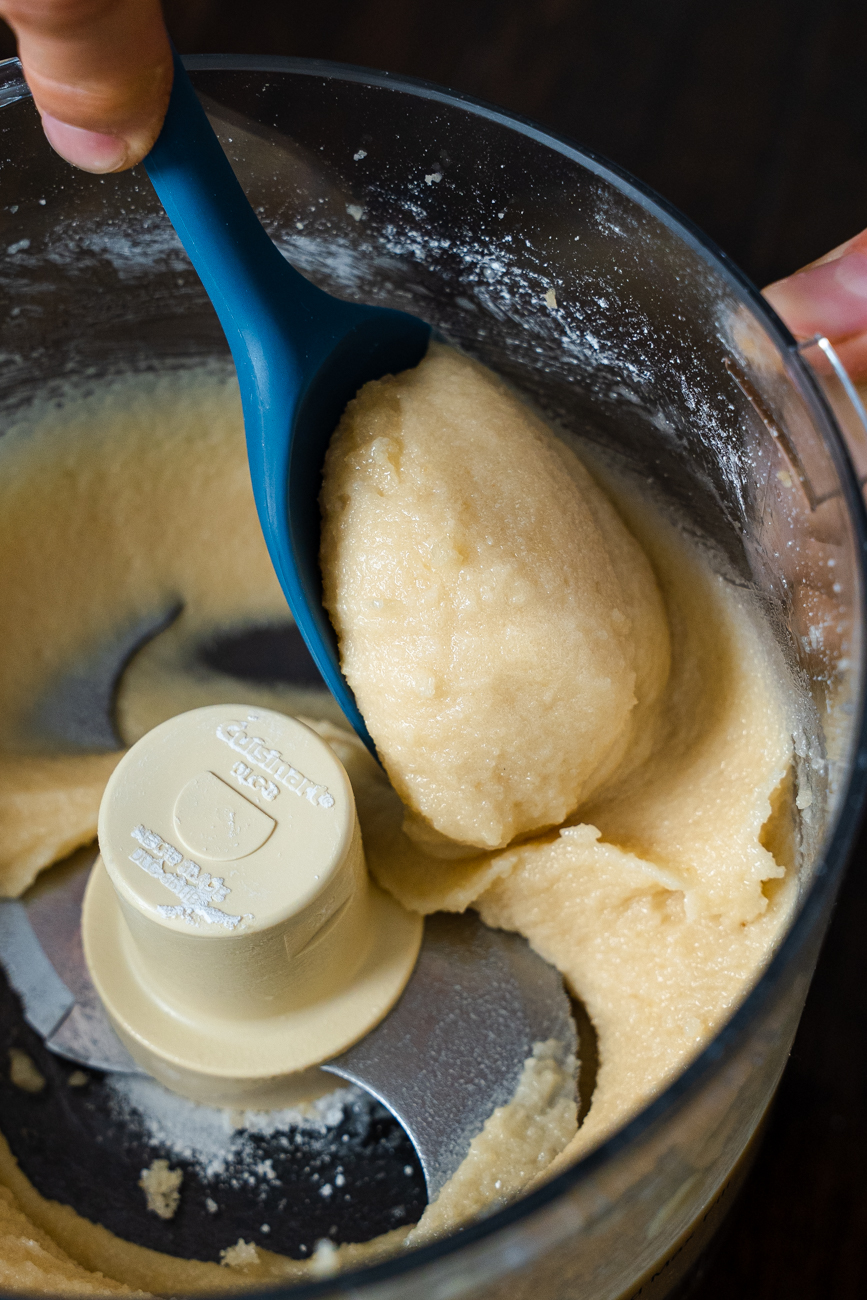 - Slice almond paste into chunk. Place in food processor along with sugar and pulse until well mixed.