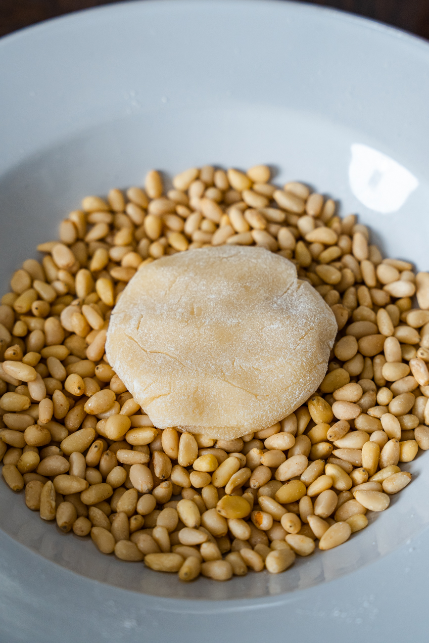 - Flour your hands, then roll the dough into 1-inch balls. Roll balls in egg white, shaking off the excess, then roll in pine nuts, applying light pressure to help them stick.