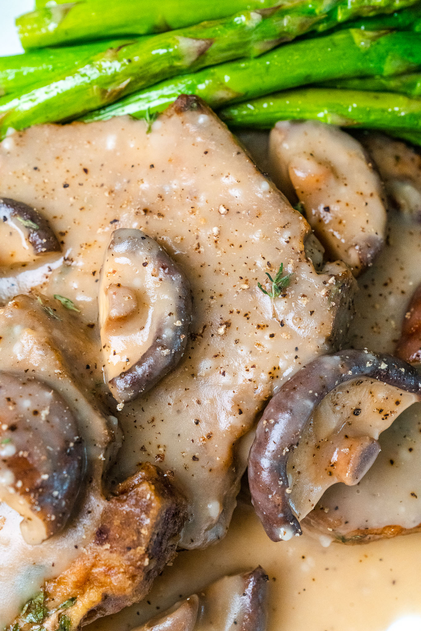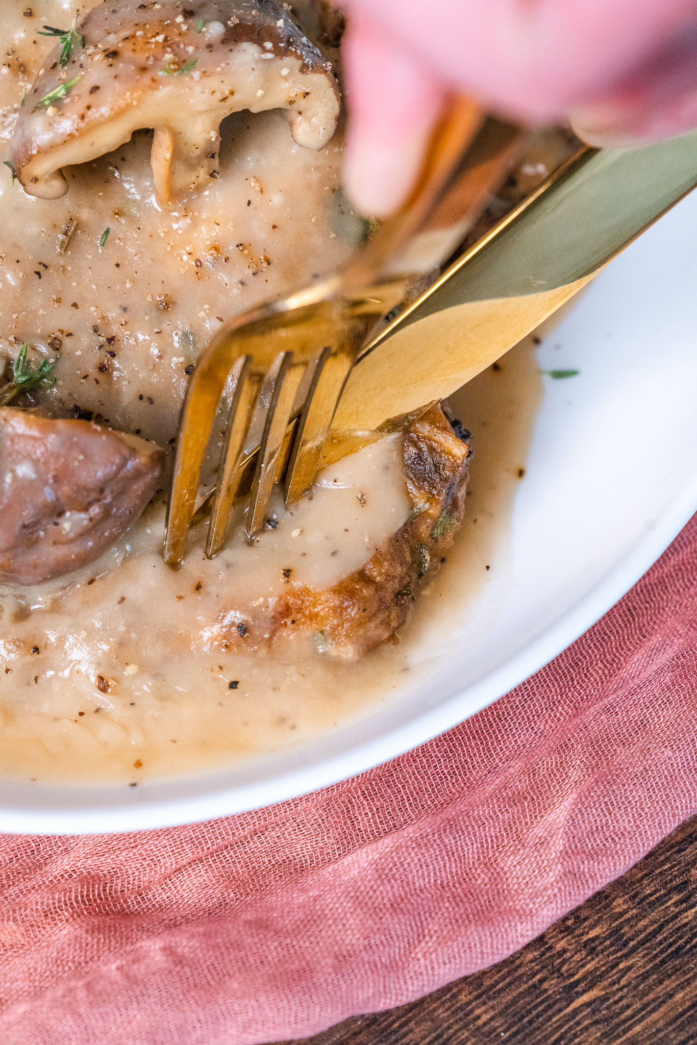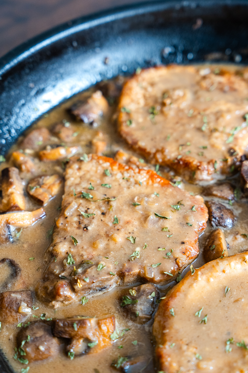 Start with beautiful pork chops from the butcher or deli counter. I don’t like huge chops, but I don’t want tiny scrawny ones either. It’s the highlight of the dish, so treat yourself to some good chops. Next, brown the veg and brown it well. I like to quarter my mushrooms for the look, but brown them well. Once the sauce is made, the unbrowned mushrooms will show.