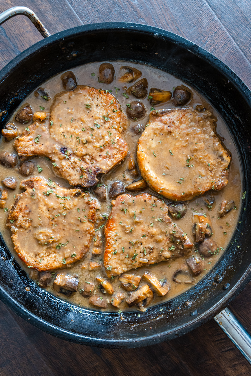 - Finish with the fresh thyme, heavy cream, and dijon mustard. Season gently with salt and pepper, then add the pork chops back to the pan. Cook the mixture until the pork chops are fully cooked at 140˚F and the sauce is nicely thickened.