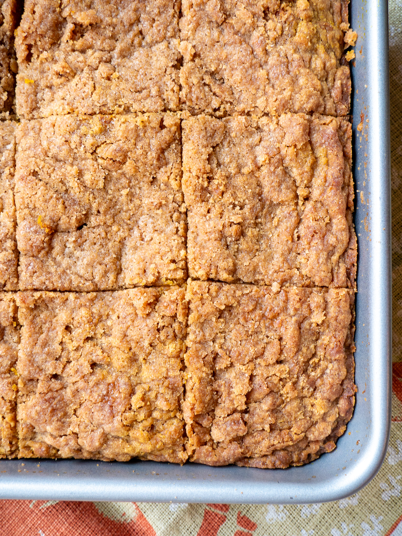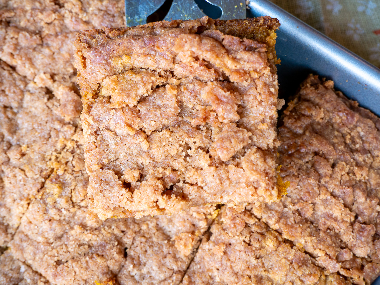 Sprinkle those coarse but delicious crumbs over the batter and pop it in the oven. More good news? This is done in just about 30 minutes and it you can serve it warm. Just slice it up right in the pan and start doling out slices whether it’s breakfast, snack, or dessert time. Enjoy!