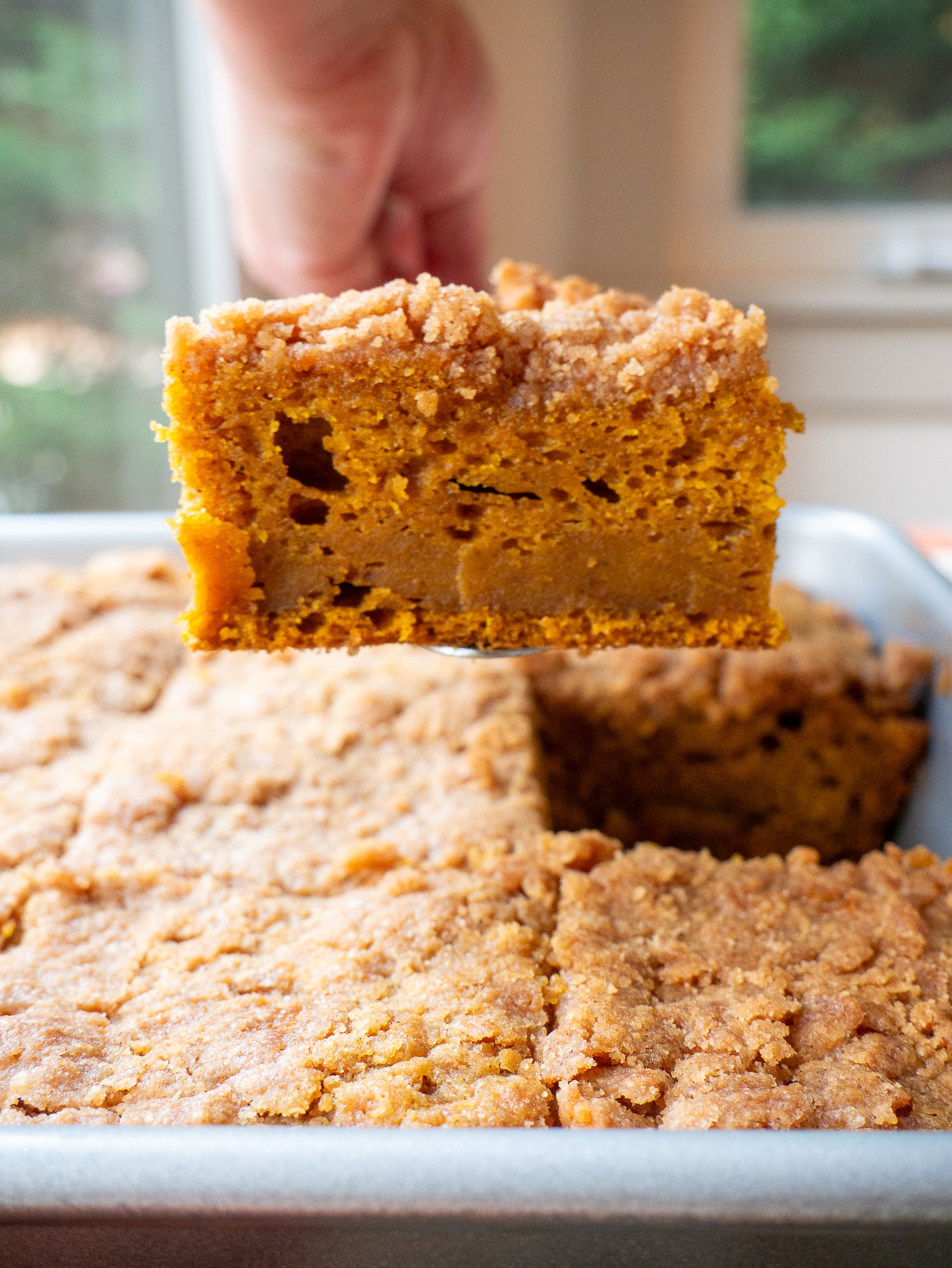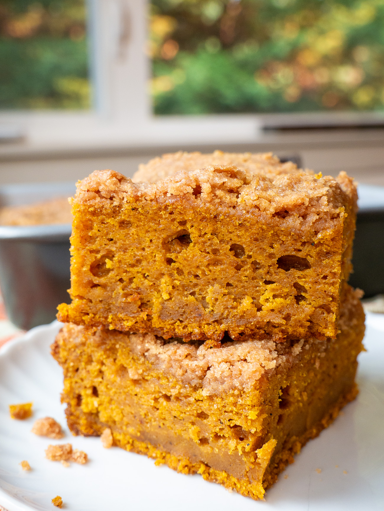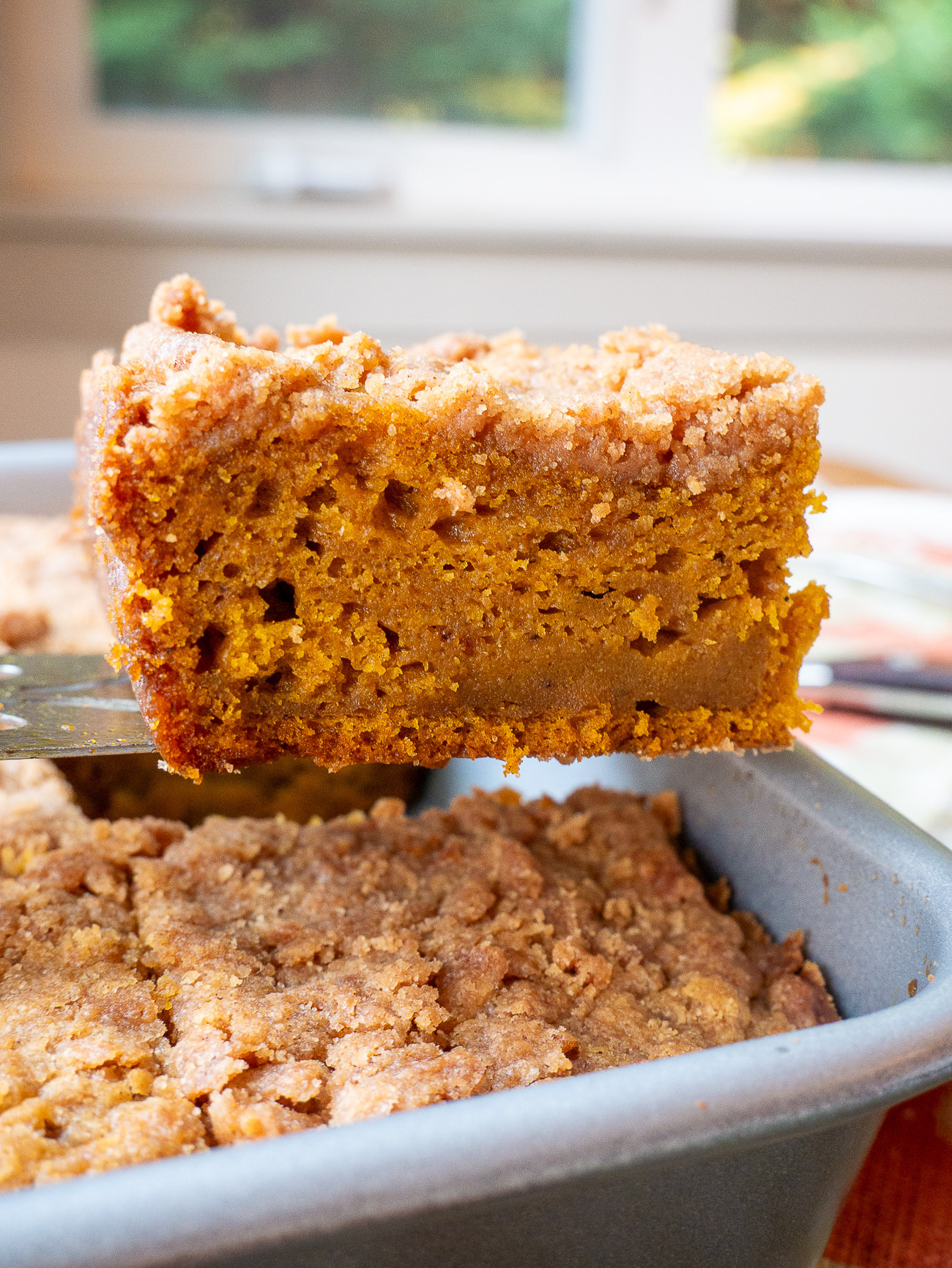 Fancy layered cakes have a time and a place but the majority of the time, it’s the simple, unfussy cakes that have my heart… The cakes that don’t need frosting or decoration, the ones you can cut and serve right out of the pan. You know, like a nice little coffee cake. This one, full of warm spices and sweet pumpkin, brings the fall flavor and walks the fine line between breakfast and dessert beautifully. And you can’t forget that streusel topping!