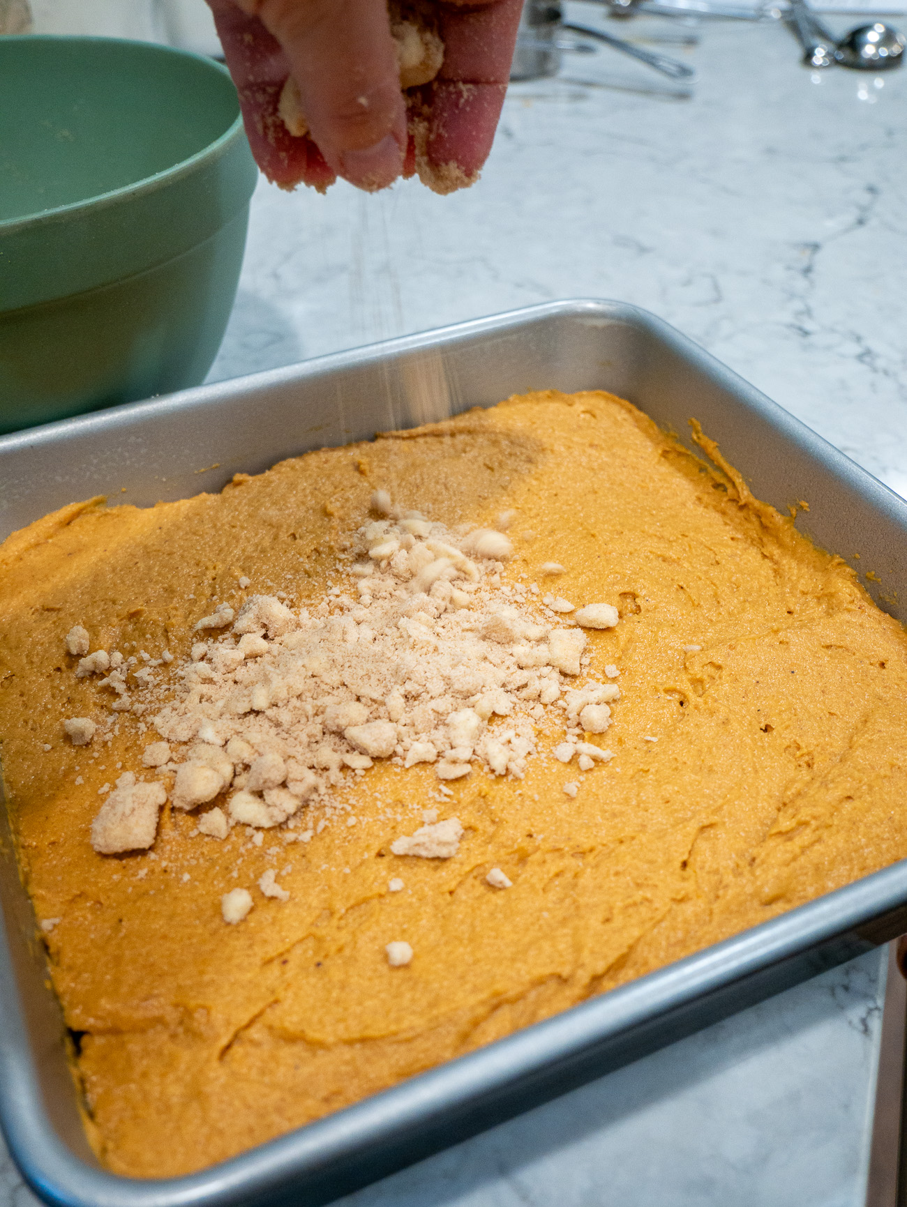 Get that in a baking dish. (9×9 works great.) And for my favorite part, make the streusel topping. To do that, simply stir together the flour, brown sugar, and cinnamon, then cube your cold butter and blend it into the sugar/cinnamon/flour mixture using your choice of your fingers, two forks, two knives, or a pastry blender. (Or any combination thereof.) You want coarse crumbs.