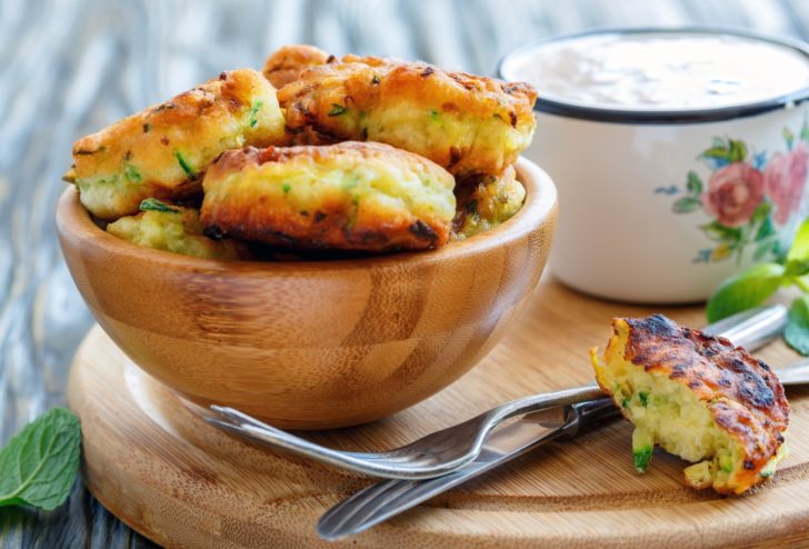 - Shape spoonfuls of zucchini batter with your hands into 3-inch diameter patties. Working in batches, add patties to pan and cook until browned and crisp, about 3-4 minutes per side. Add more oil as needed.