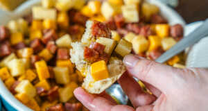 While the berries do their thing, you can get to work on the shortcake dough. You’re going to cut some cold butter into a mixture of flour, baking powder, and sugar until it resembles coarse crumbs…