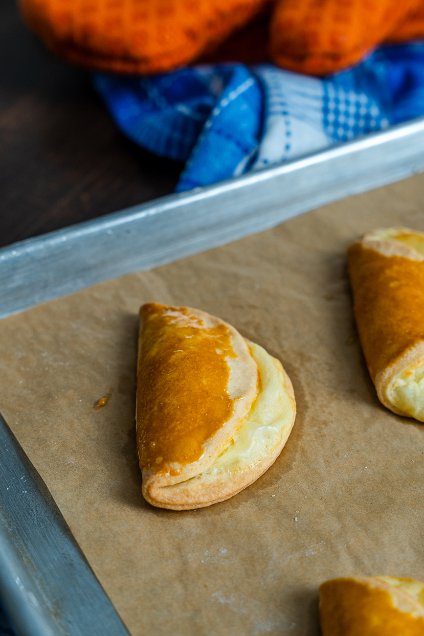 - Fold empty dough half over the filling and press down lightly. Brush cookies with reserved egg yolk.