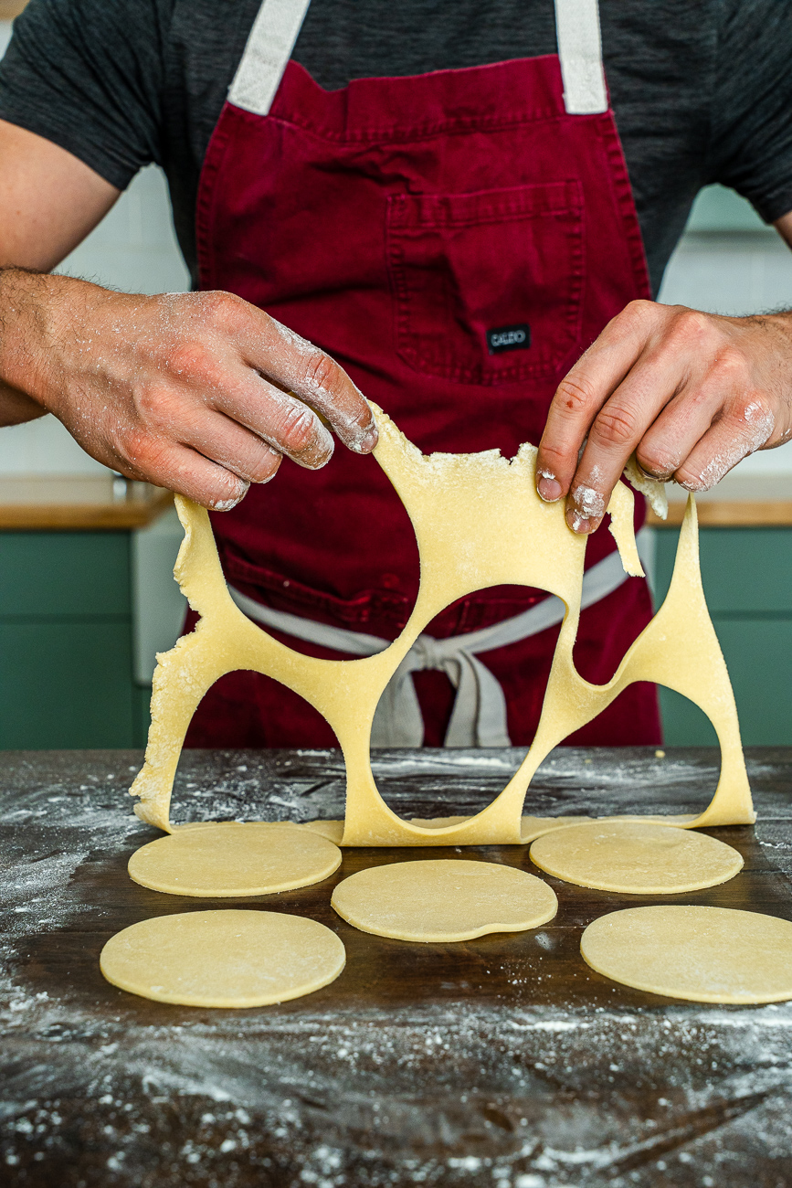 - Roll the dough out to 1/4 inch thickness. Using a circular or crinkle cutter, cut 4-inch circles of dough.