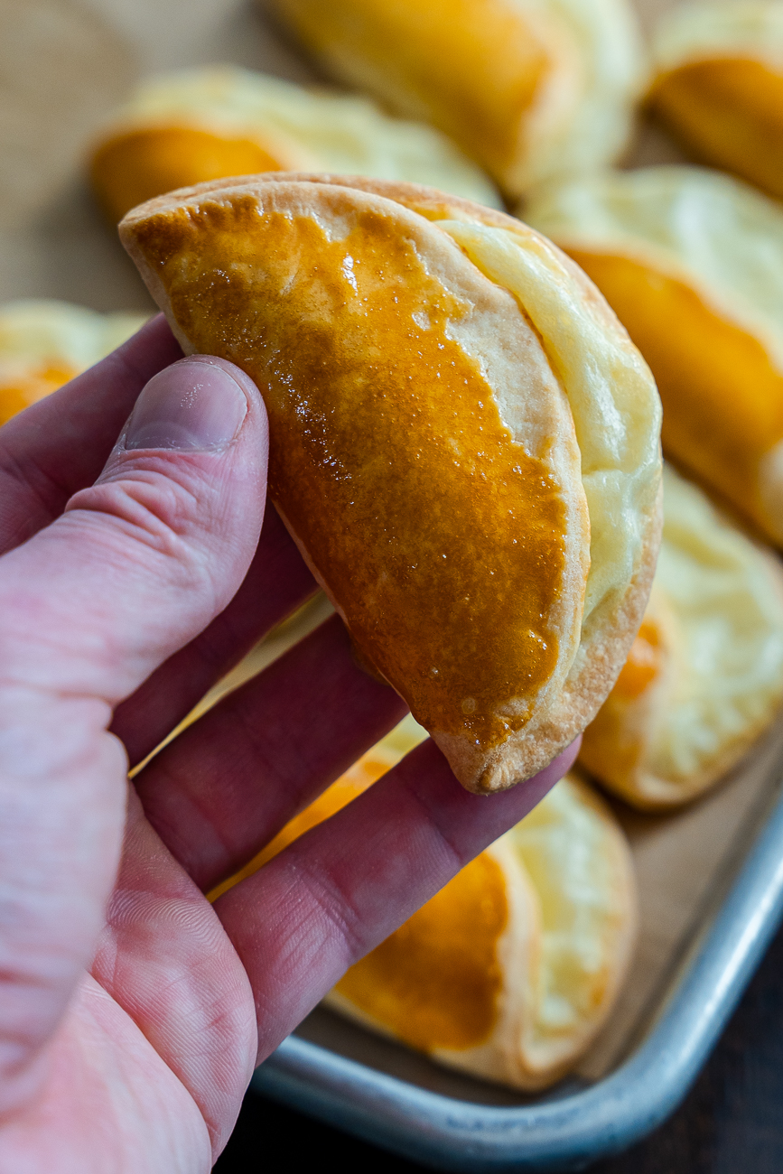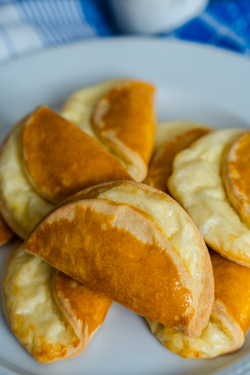 Once the dough is cut out into round circles, a sweetened cottage cheese fortified with egg, sugar, and sour cream gets spread on top to keep the portion of dough.