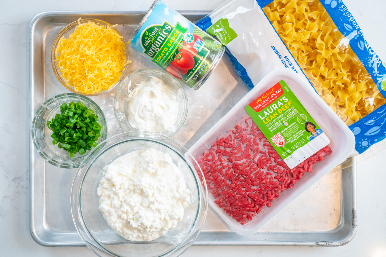 You do not need anything fancy here. Quite the contrary, in fact. The base is egg noodles, which I like because they are a little softer than many of their counterparts but still chewy. Then you need ground beef, a can of tomato sauce (no seasoned marinara needed here), some cheddar cheese, some sour cream, cottage cheese, and a sprinkling of green onions. See? Easy.