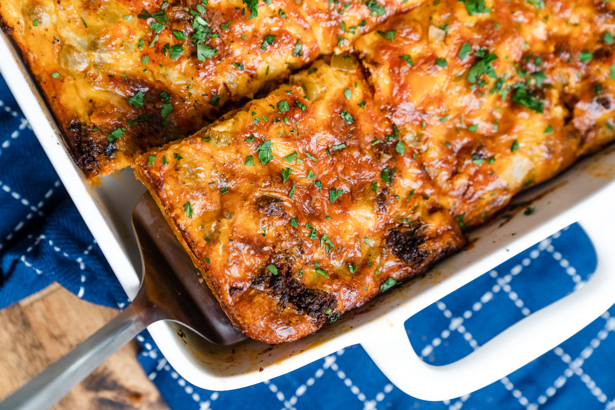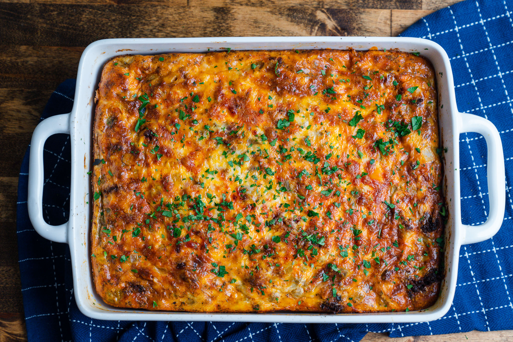 Chorizo is a spicy pork sausage, brick red in color from the red chiles that are mixed with the ground pork. It packs a spicy kick, which will be enhanced by the additions of chili powder and canned green chiles (you can choose what heat level you’d like here). This heat is balanced by eggs, milk, and plenty of cheese, and gets some additional texture and substance with the essential frozen breakfast blend of O’Brien potatoes.