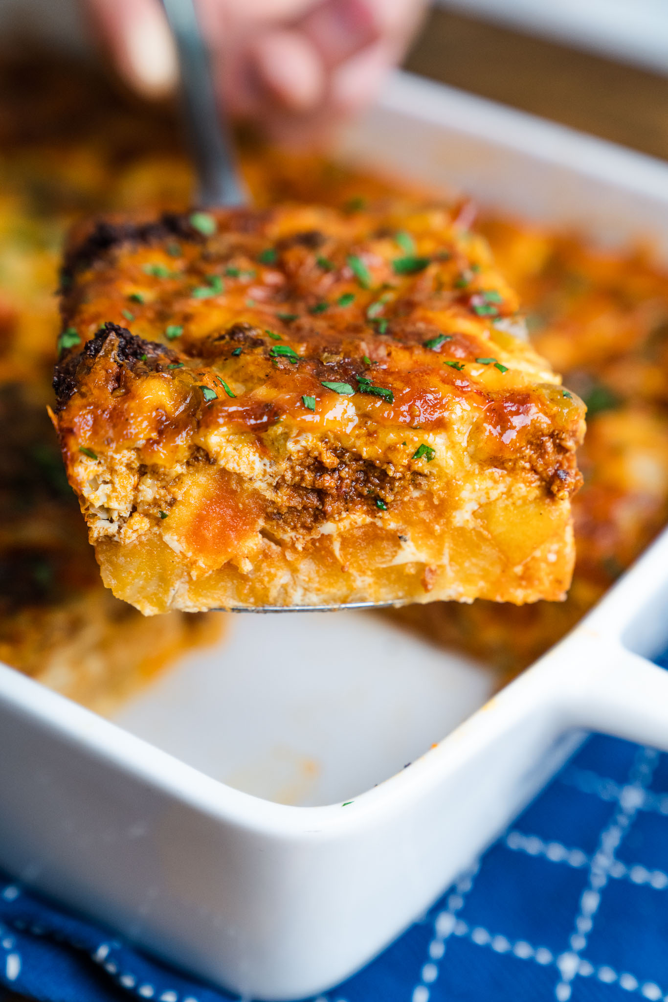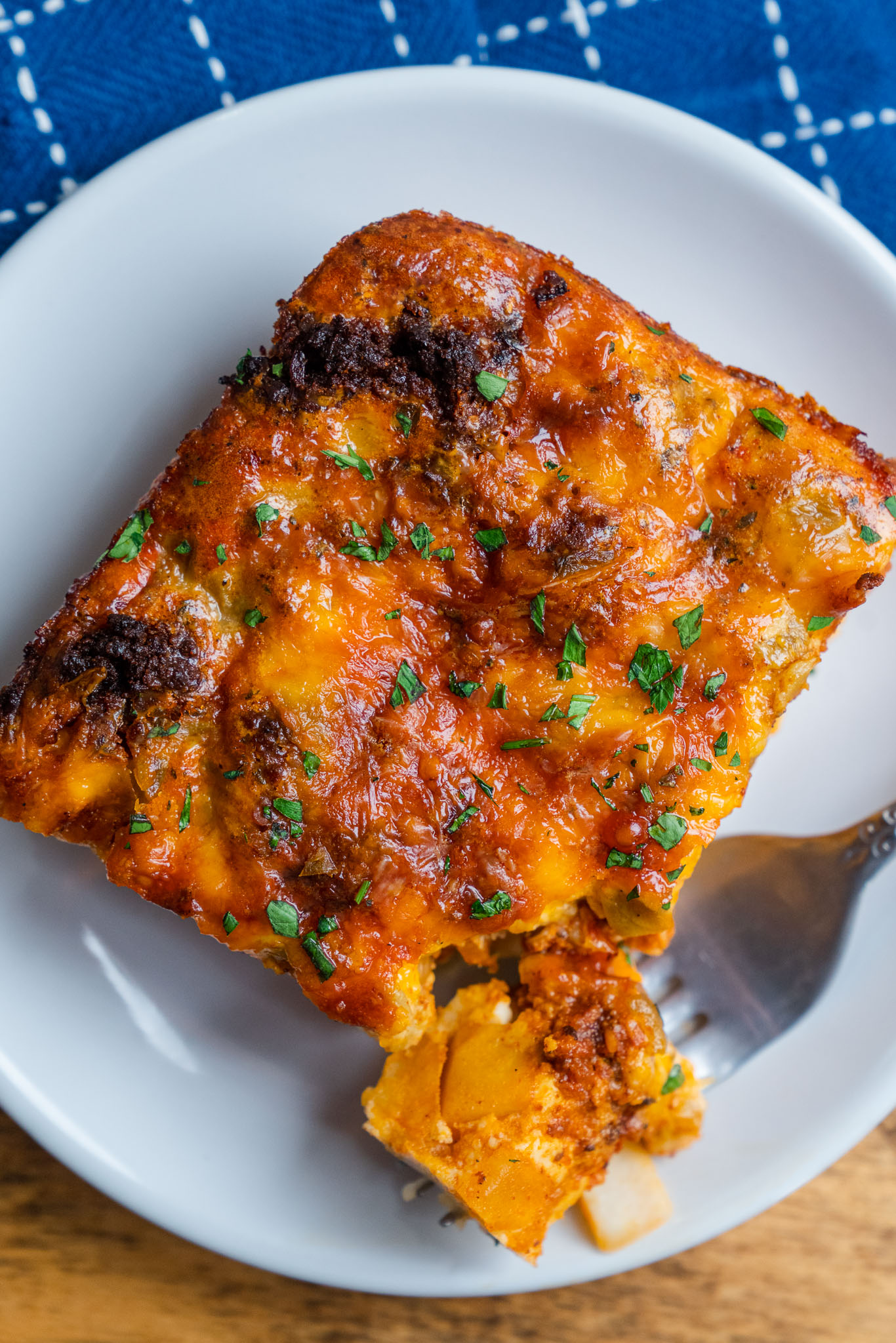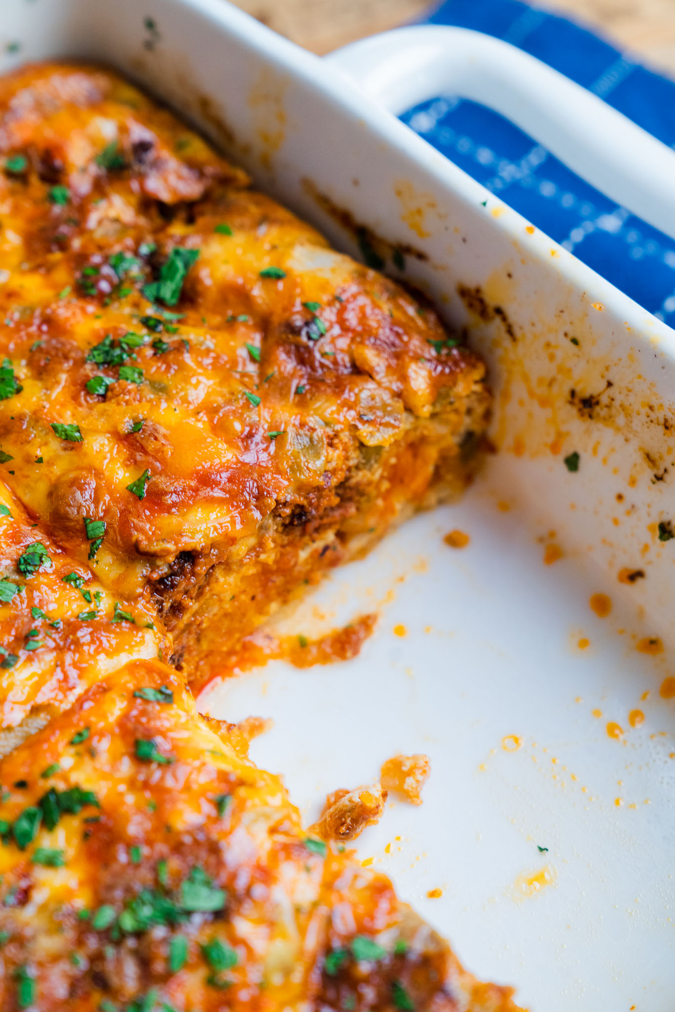 The casserole will need a few minutes to set before it’s sliced for serving; this essential pause allows the casserole to cool and the eggs to finish setting up. I like to scatter chopped cilantro over the top for a bit of freshness before serving (use parsley if you’re not a cilantro fan).