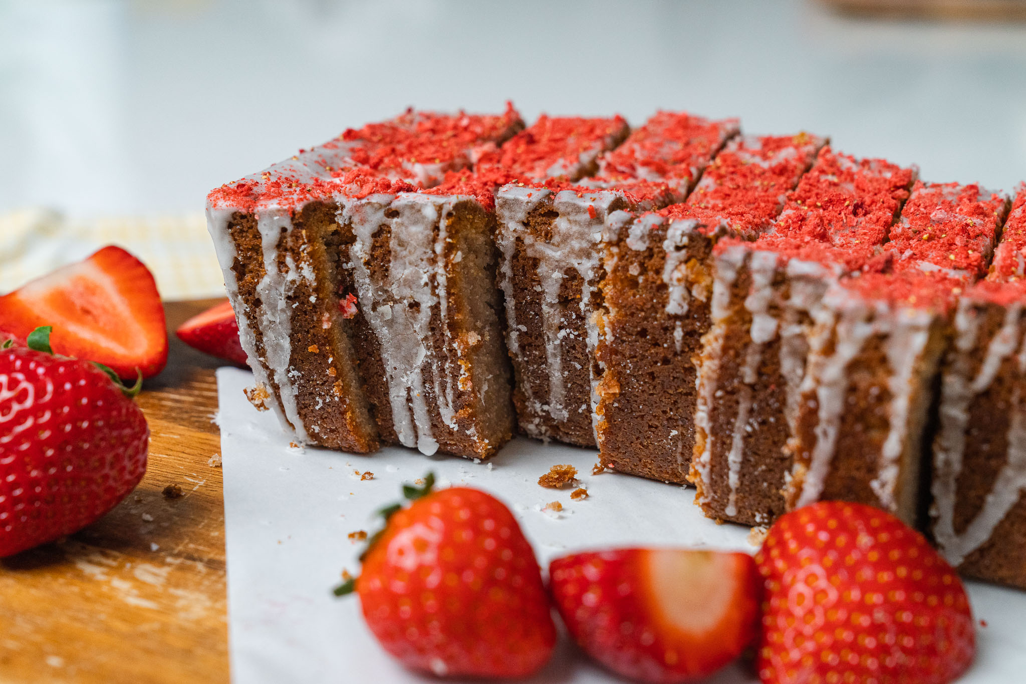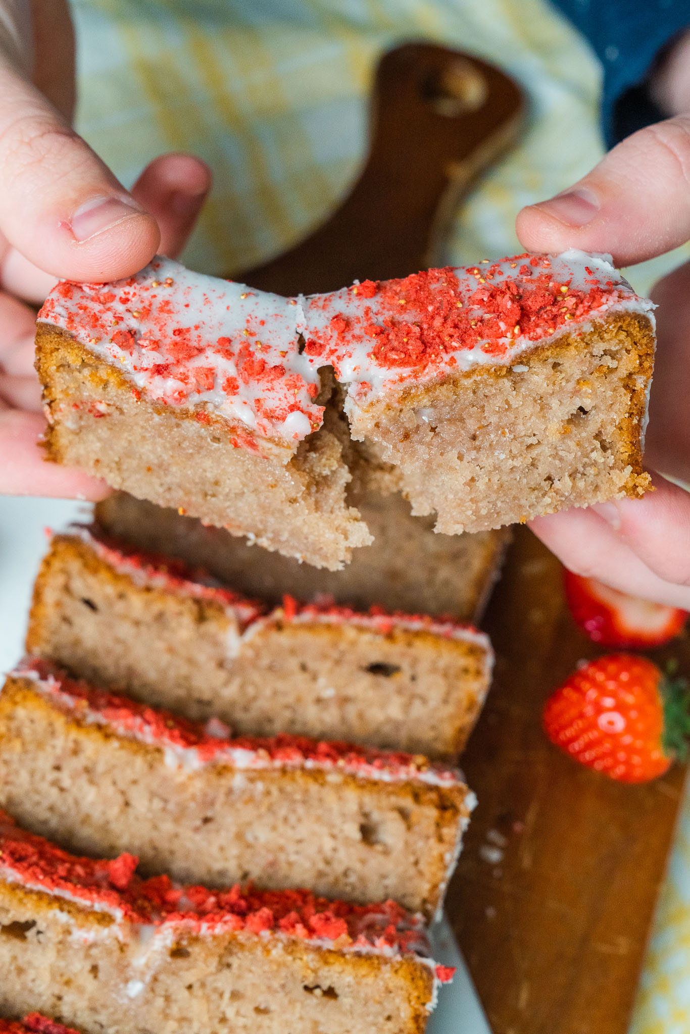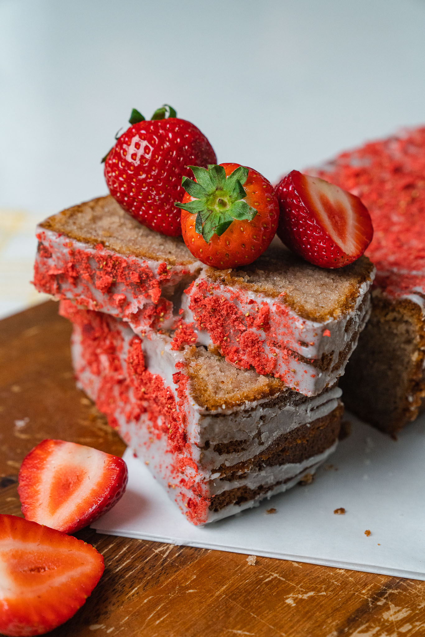 - Remove the loaf to a wire rack and let rest for 5 minutes. Remove loaf to the wire rack and drizzle with glaze, then sprinkle with dried strawberries, and let cool fully.