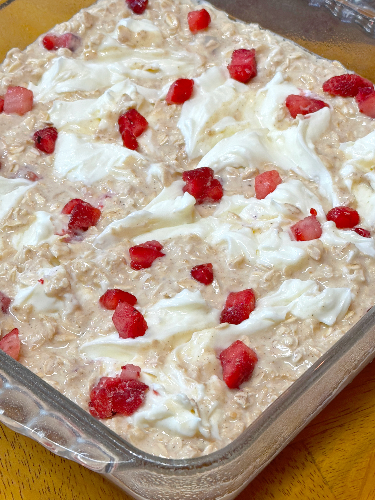 - 1 cup chopped strawberries, if frozen defrost them (you can keep some strawberries reserved to garnish on top of the baked oatmeal)