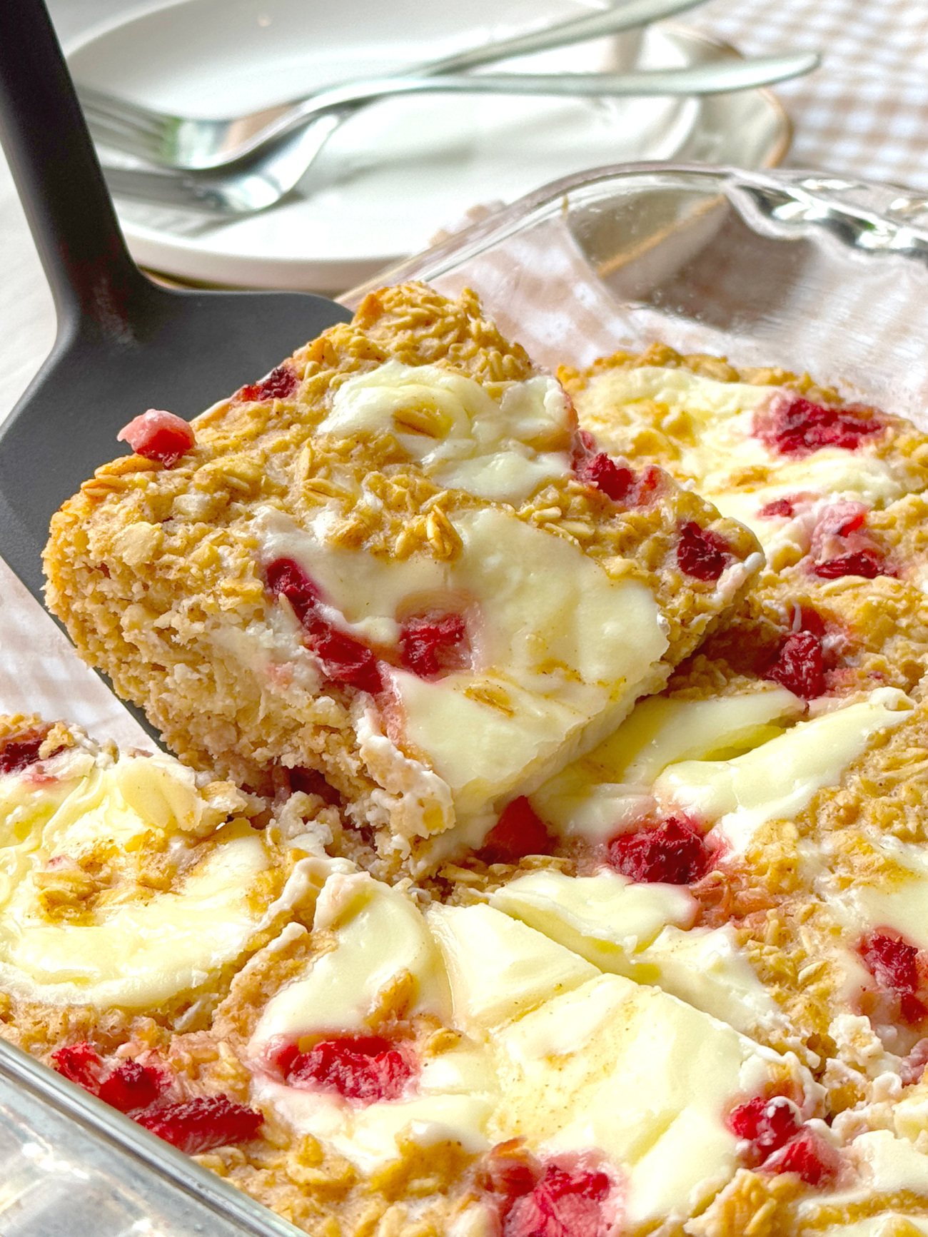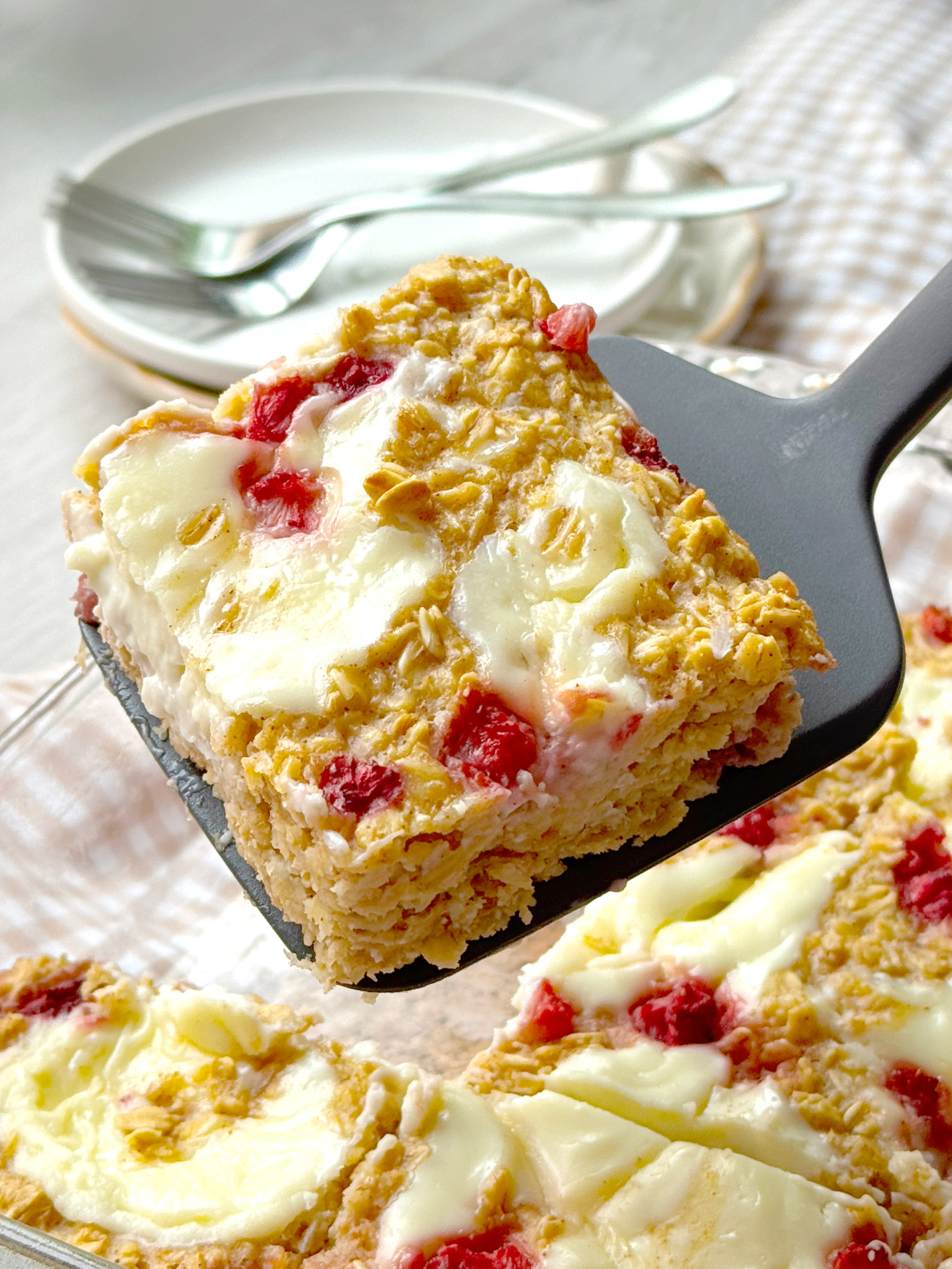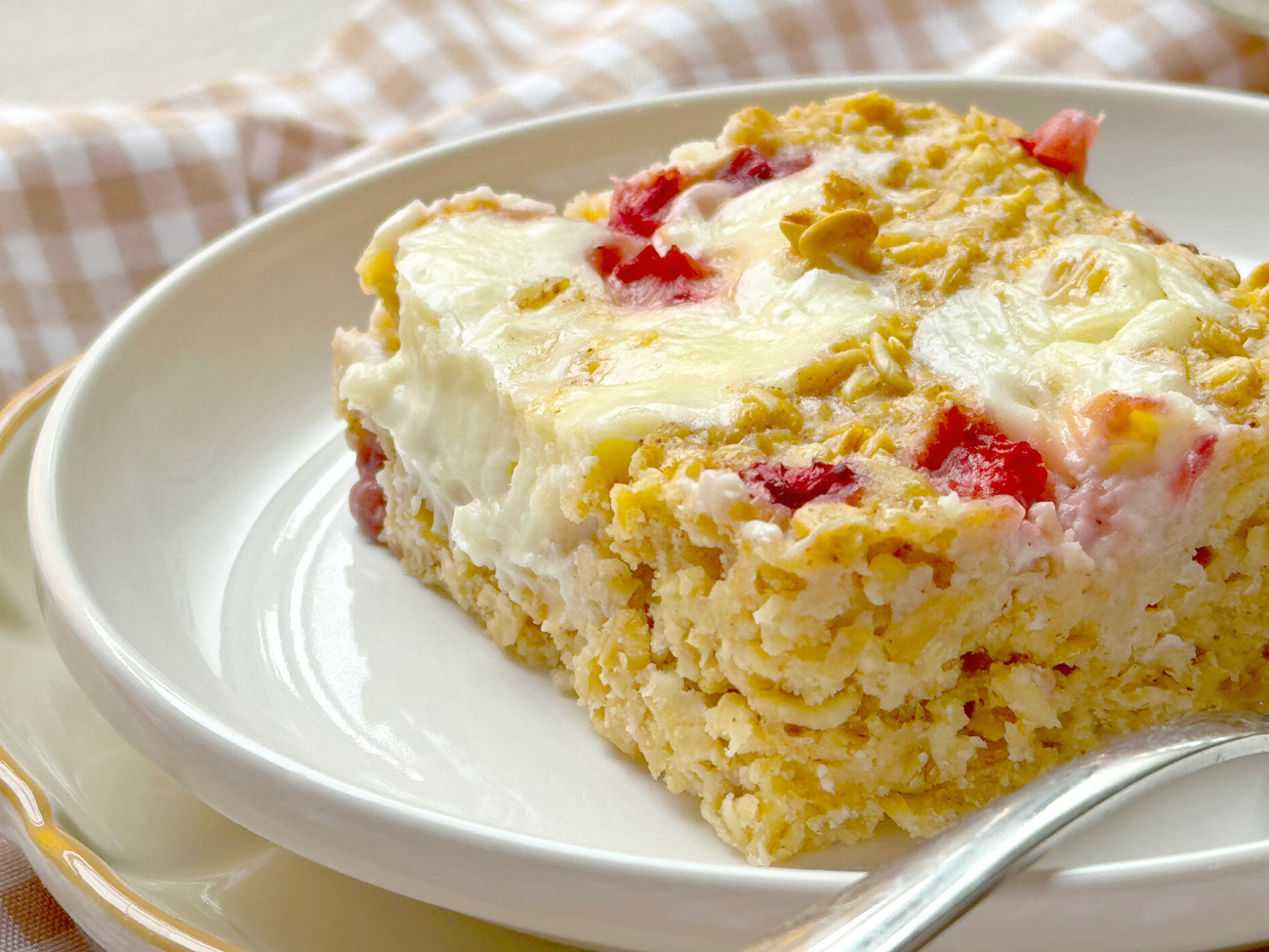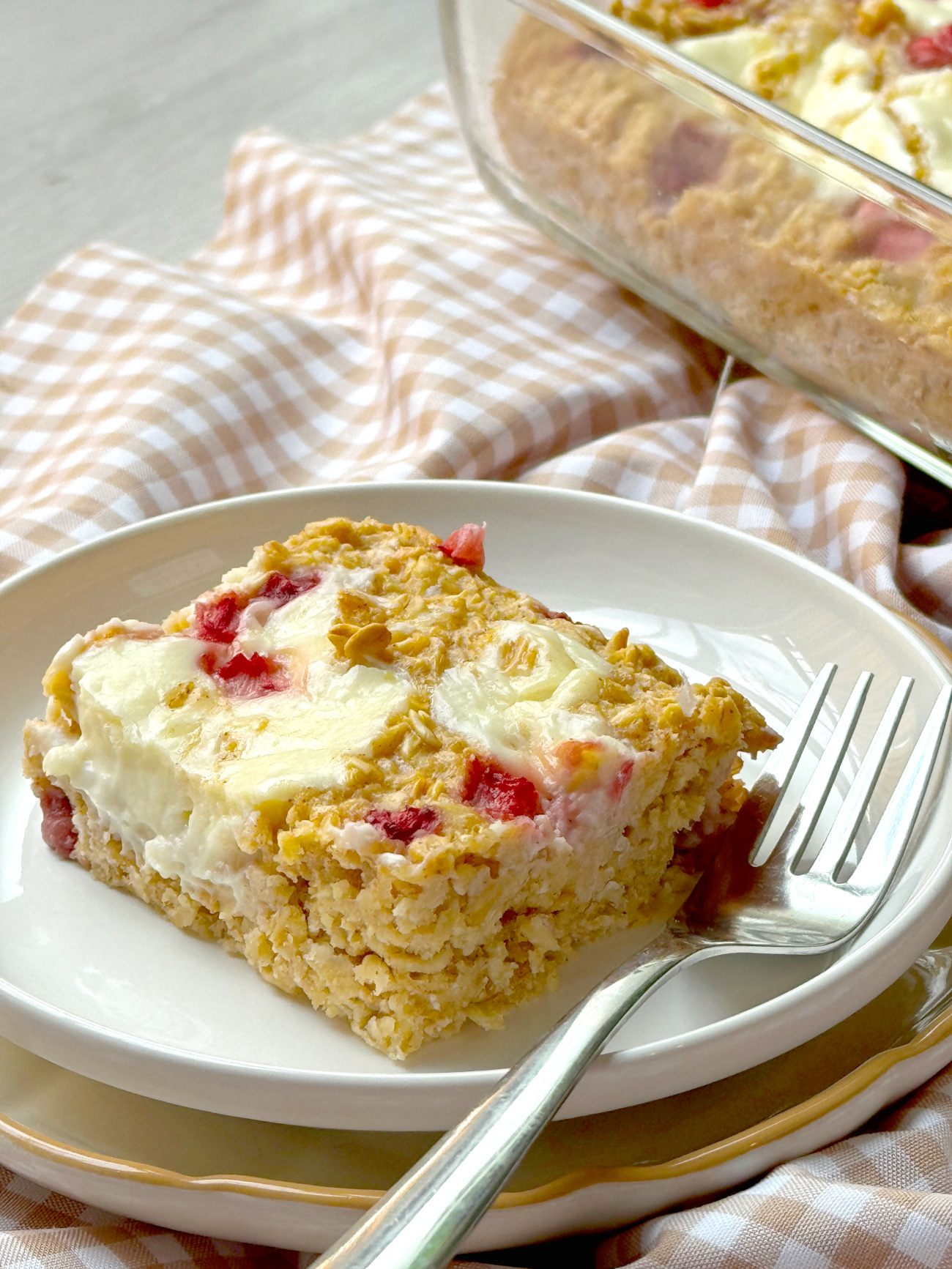 This recipe uses the tiniest bit of flour to bind the oats into a cake-like batter. Chopped strawberries are folded into the batter and used as a garnish on top of the batter as well. A quick, sweetened cream cheese is swirled with strawberries on top, giving the bake a bright and lively visual appeal.
